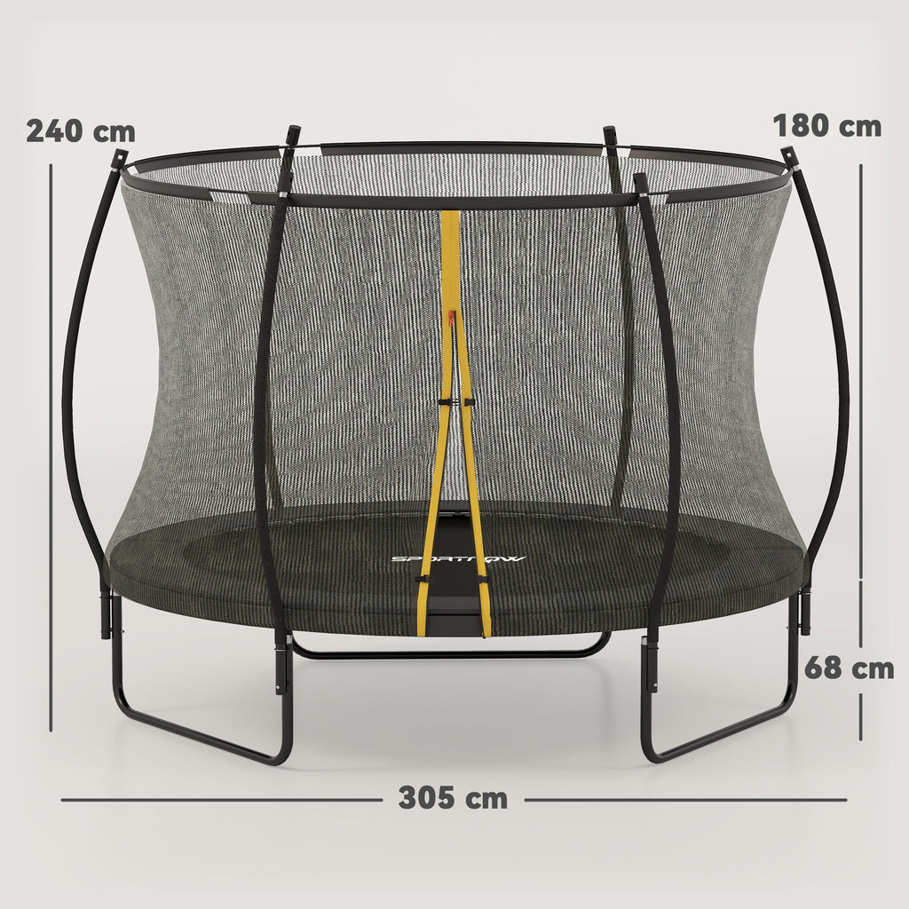 Leap into fun with the 10ft trampoline! Designed with safety in mind, it features innovative curved poles and an enclosure net to minimise injuries. Experience unmatched bounce thanks to 54 high-tension springs, while the three U-shaped solid feet ensure stability. Plus, the double-sided zipper door makes entry and exit a breeze. Great for endless garden entertainment!