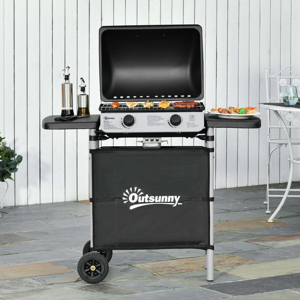 gas grill is a great choice for family or friend gatherings, which can provide delicious food for a large number of people. 2 burners can be used individually. Equipped with 2 extension tables on both sides, which can provide the required storage space and preparation space. Including two wheels is quite convenient for you to move it. Great addition for anyone who looks forward to cooking outdoors.