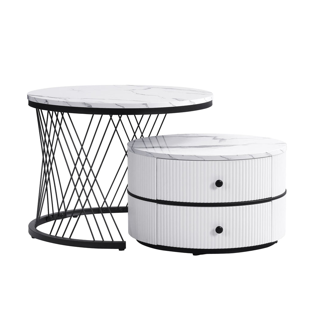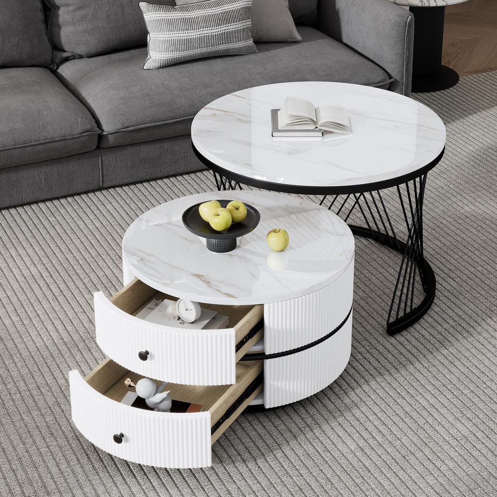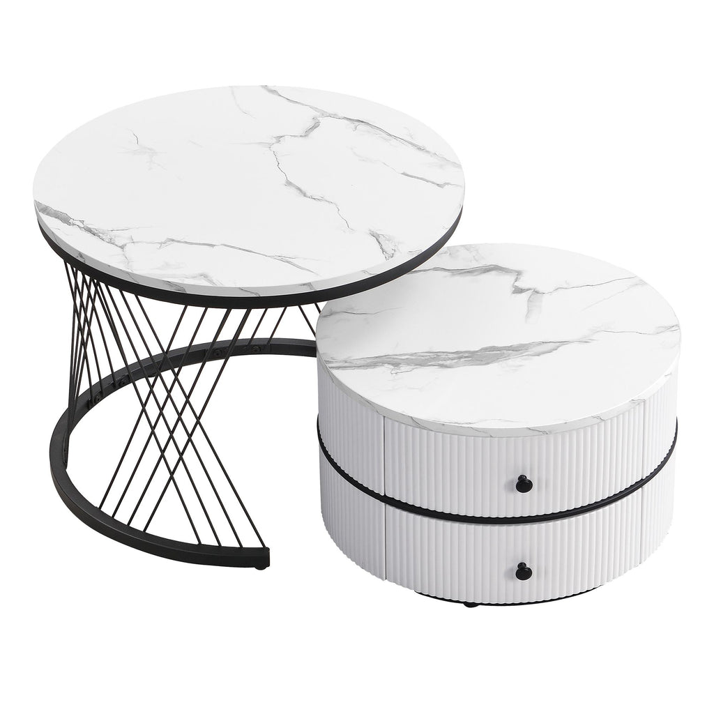 2 Piece High Gloss Round Nesting Coffee Table Set with Marble-Effect Top, Living Room Tables with Storage Drawers, White+Black