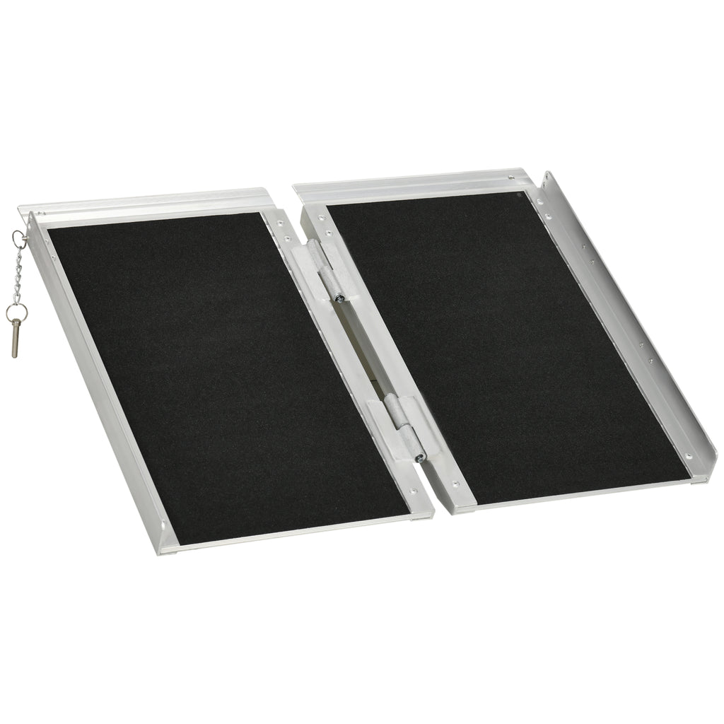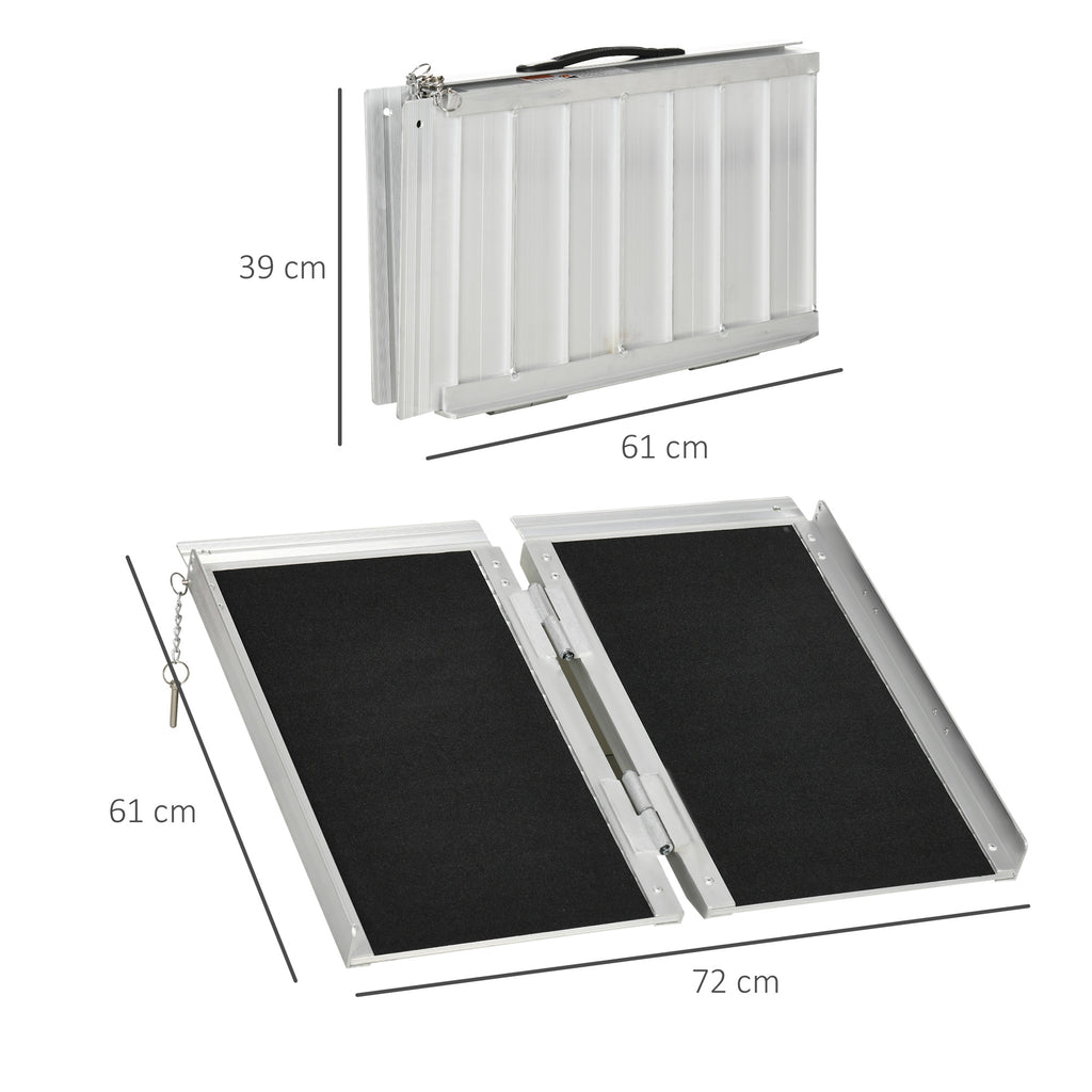 Let help create complete, easy mobility with our portable wheelchair ramp. Built from a sturdy, anti-corrosive aluminium alloy, this ramp for wheelchairs uses a ribbed surface to prevent sliding and has two high side walls to help prevent accidental falls. The ramp for scooters is 61cm long, and applicable height is 5-15cm, recommended height is 5-10cm. Not only for use with wheelchairs, this folding ramp provides ease of access for scooters, bikes and any other unwieldy wheeled object.