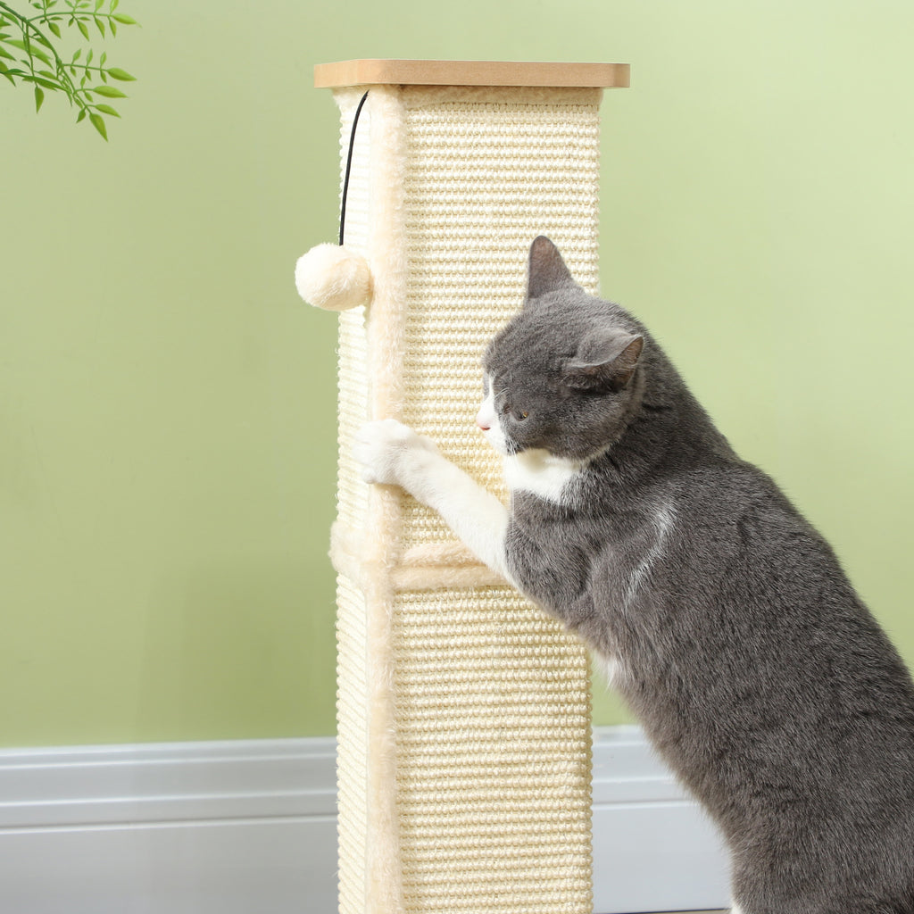 Every cat owner needs this scratching post, which turns any corner into a pet playground. Cats can scratch to their heart's content while the hanging toy ball captures their attention during playtime. At the bottom, a turntable rail with two track balls lets them chase and swipe, satisfying their hunting instincts. The tall frame allows for stretching, with the wide base with a non-slip footpad ensuring stability. Great for indoor cats, this post keeps them active, playing and scratching.