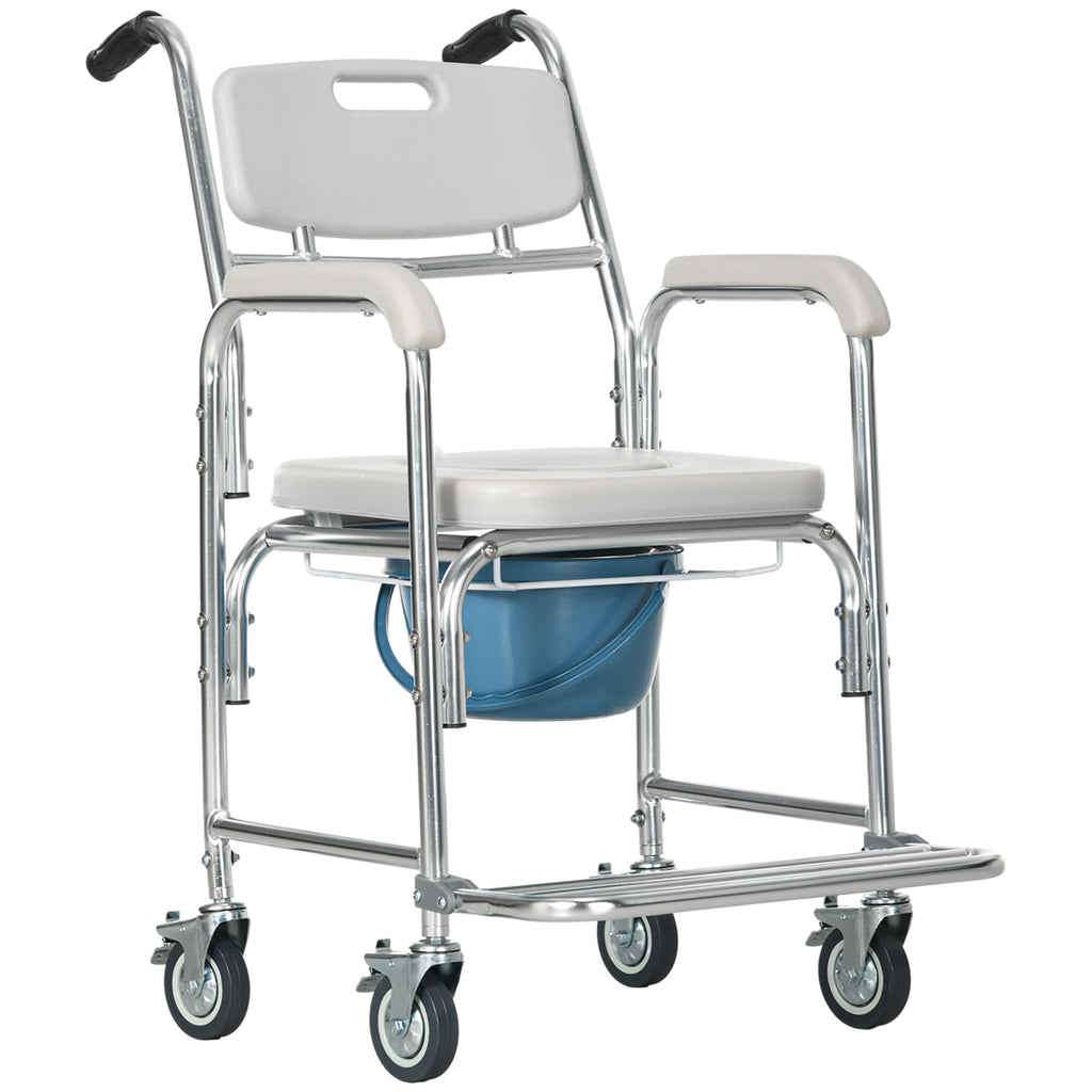 This shower commode wheelchair with footrest is a multi-use piece, for whoever requires help. Use at the bedside as a temporary toilet, to help you move into the shower - or as an over toilet wheelchair so you don't have to bend down and strain yourself. Fitted with a removable bucket, it is easy to empty. With an aluminium frame, the frame is strong and supportive and is naturally suitable for moisture-filled environments. Complete with wheels and brakes to move around easily.