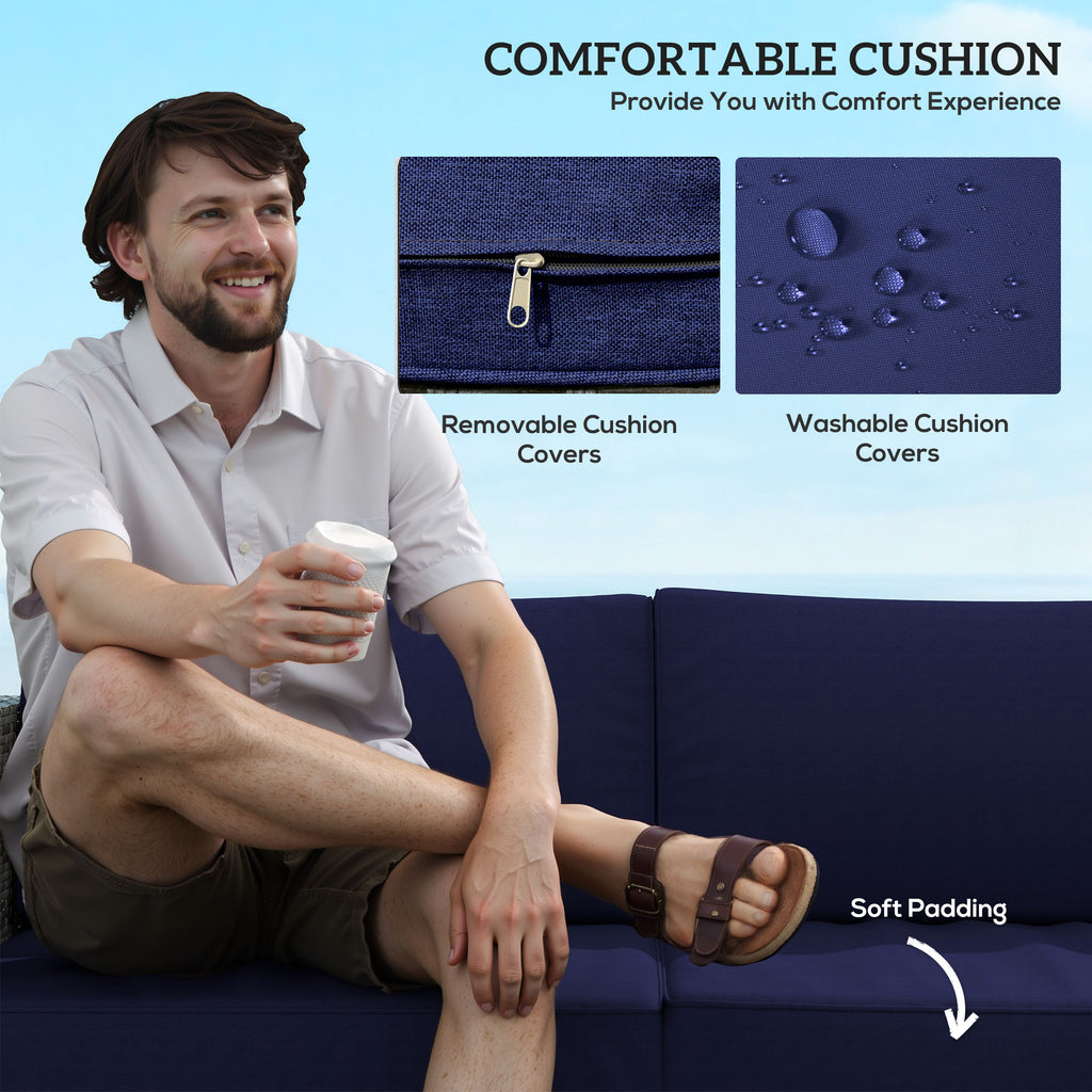 Relax in style, this season and beyond: welcome this rattan sofa set into your garden and beyond. Although suggested as a rattan corner sofa shape, you can also sort it out long ways. A metal frame for a strong core, wrapped in plastic rattan-a stylish garden look, with double the durability. This conservatory furniture set comes with two loveseats - both come with padded cushions for comfort. Complete with a glass-top table.
