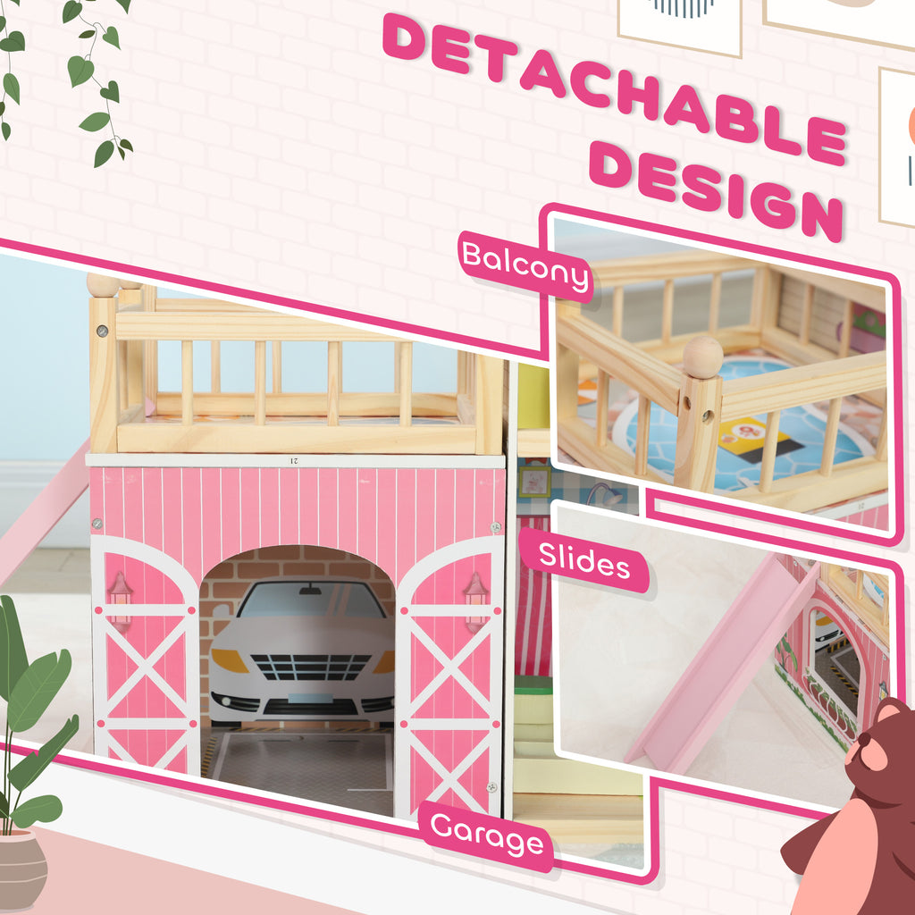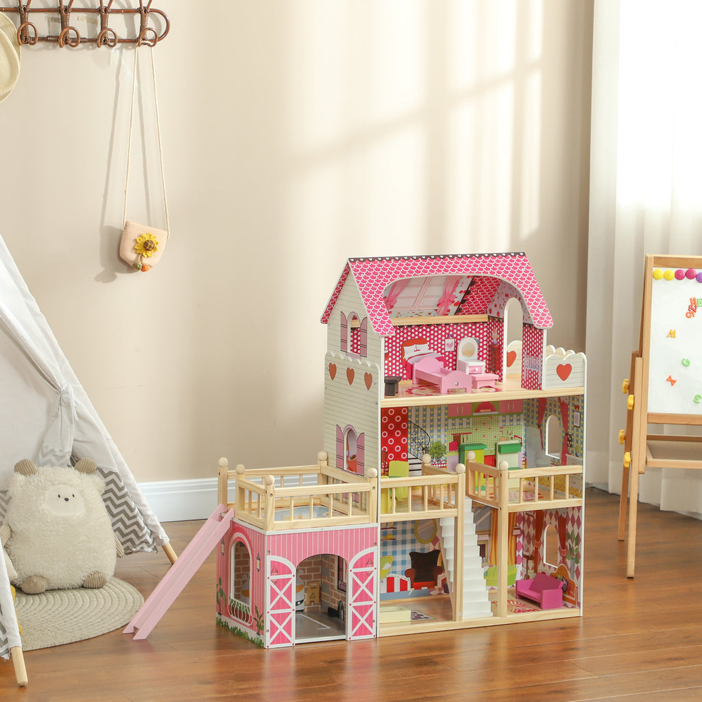 Step into a world of imagination with the dolls house! At 92.1cm tall, this three-story, vibrantly furnished toy house features an open layout, suitable for toddlers to arrange 13 delightful furniture pieces. It includes a detachable balcony, garage and slides, enhancing playtime and social skills in a large dolls house crafted from safe MDF material. Tailored for gift-giving and shared fun!