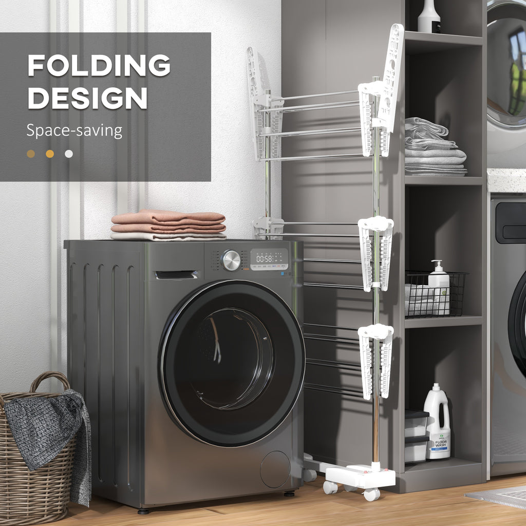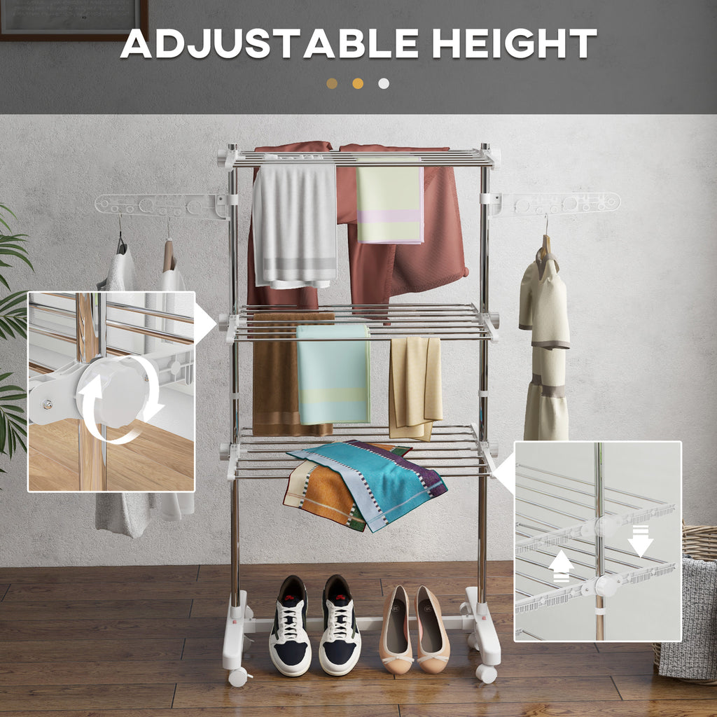 3-Tier Clothes Airer, Foldable Clothes Drying Rack, Stainless Steel Indoor and Outdoor Clothes Dryer with Wheels and Wings, Easy Assembly, 142 x 55 x 152cm, White