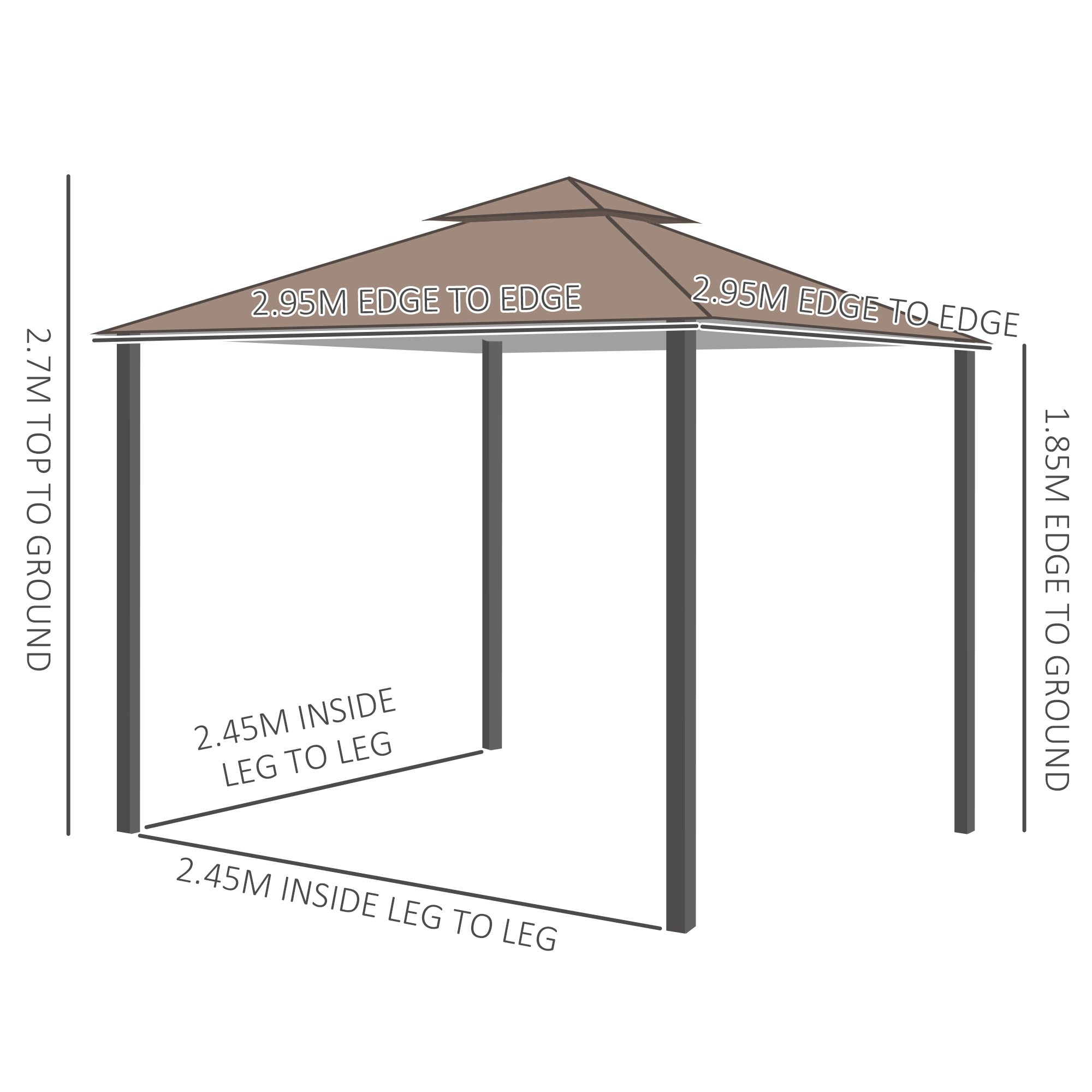 This metal gazebo is a great addition to your Garden, Patio or paved area of your home. It has a metal frame with a UV resistant polyester top cover and side nettings. The top cover also features a double roof design for air circulation with 8 drainage holes for rain. The strong gazebo comes complete with side net walls which are great for protecting from bugs and flies. A multifunctional garden gazebo for any occasion which will match any outdoor décor.