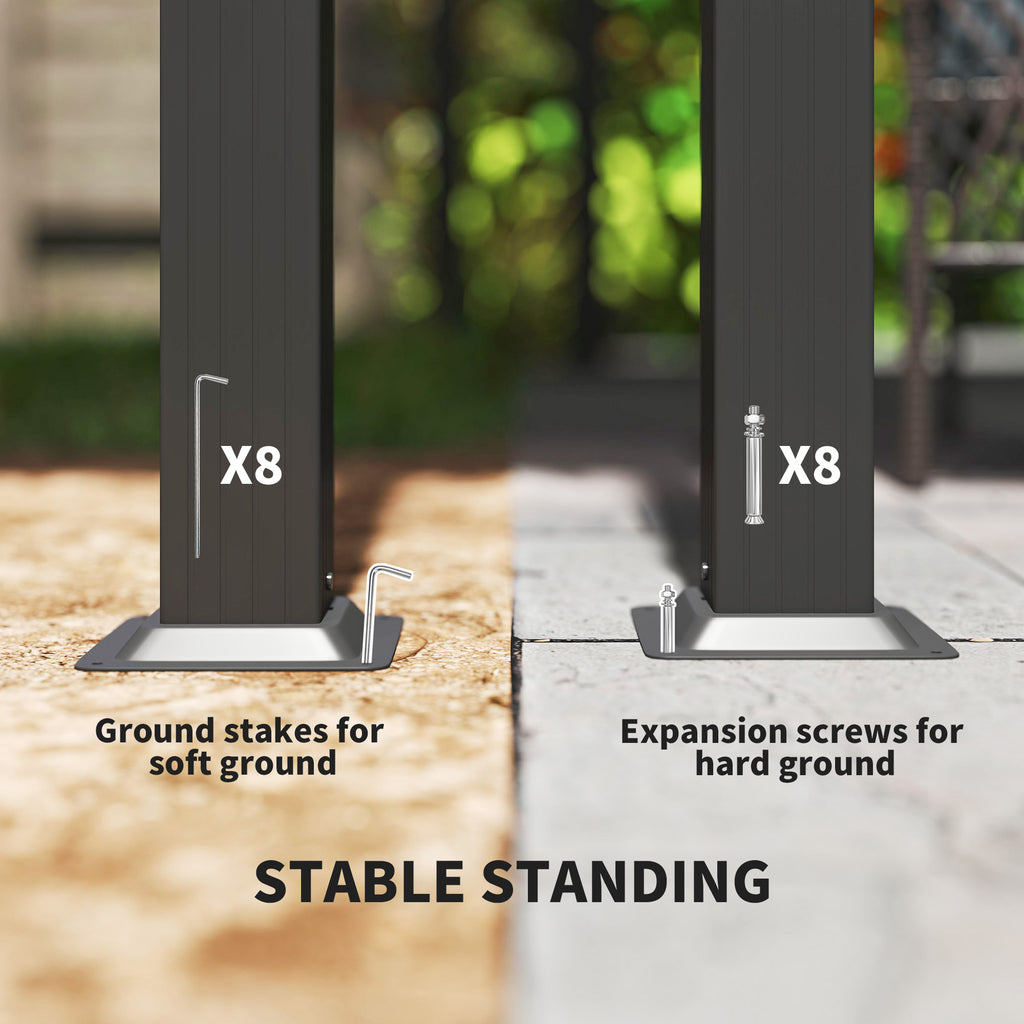 This retractable pergola allows you to be in control - enjoy the sunshine or relax in the shade. Move the fabric roof panel to a position of your choice, letting you be fully in control. The aluminium structure is strong, with ground stakes and expansion screws included to attach to the floor. Grommet holes on the fabric for easy water drainage. Enjoy your outdoor space more than ever before.