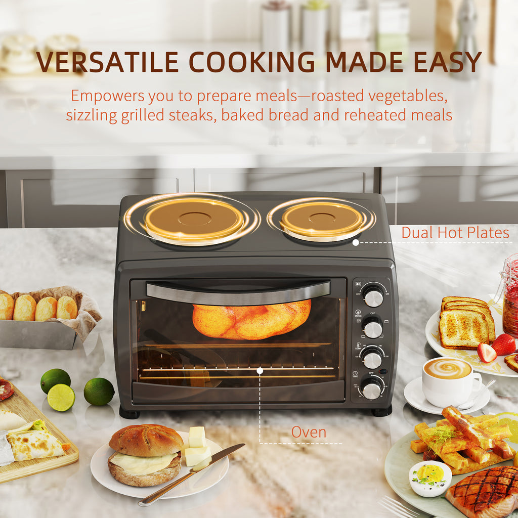 Discover the versatility of the Toaster Oven, a compact culinary powerhouse. With dual hot plates and a 2600W small oven and grill, you can roast, bake, and grill effortlessly. Fit a 12-inch pizza or a whole chicken in its spacious 36L interior. Featuring adjustable temperatures and a handy timer, this small oven simplifies cooking, making it a brilliant addition to any kitchen.