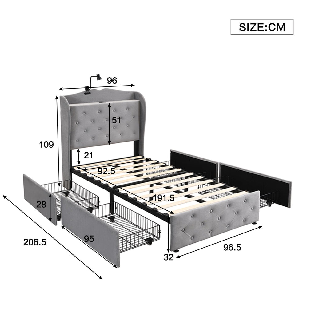 Elevate your bedroom with this stylish and functional Upholstered Bed, perfect for both adults and teenagers. Measuring 206.5L x 96.5W x 109H cm, this 3FT single bed features a sturdy cross iron frame and 12 wooden slats for maximum durability and stability. The grey velvet fabric, foam padding, and adjustable table lamp with three brightness levels add a touch of elegance and comfort. With four built-in drawers on universal wheels and four USB ports (3 Type-A and 1 Type-C), this bed offers ample storage and modern convenience, making it a practical and chic addition to any room.