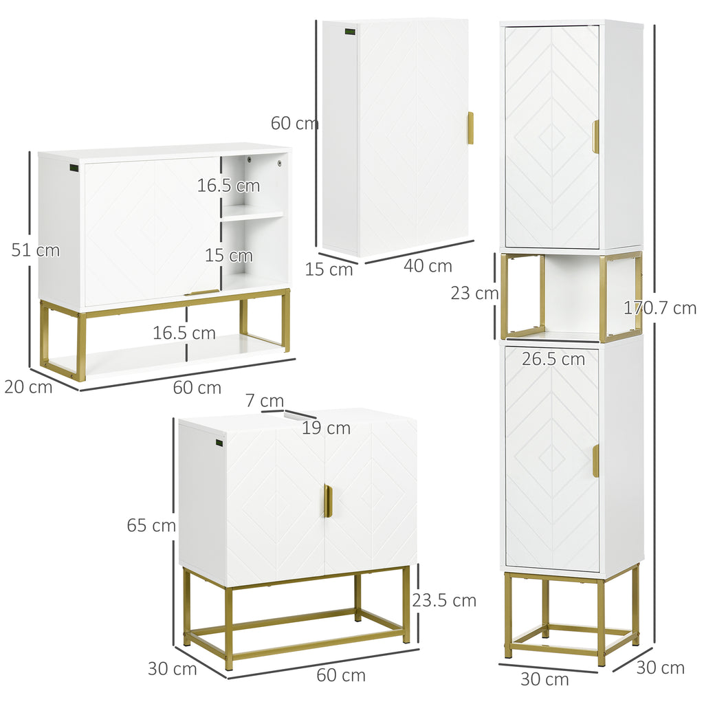 Transform your bathroom with the bathroom furniture set. This chic ensemble includes a tall bathroom cabinet, an under sink cabinet and two stylish wall cabinets, all adorned with white embossed doors and elegant gold-tone accents. Enjoy lots of storage with adjustable shelves and a space-saving design that keeps your floor clear and your essentials organised.