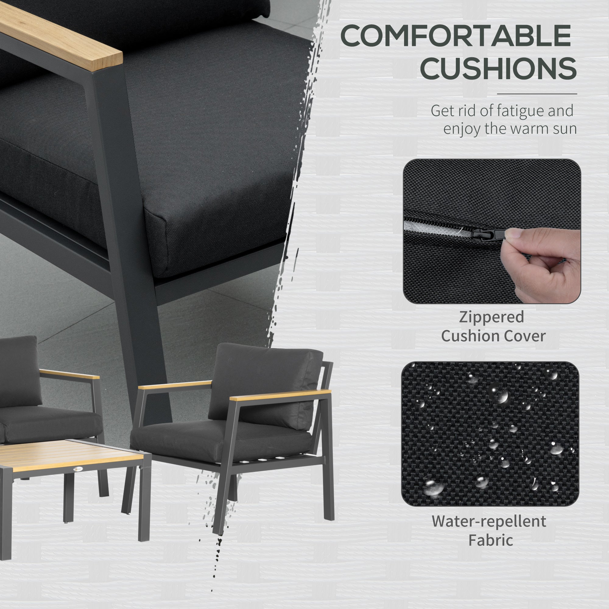Keep your garden dining simple - with comfort at the forefront with our aluminium garden furniture sets . The patio set comes with two armchairs, a loveseat and small table. Each frame is made from powder coated aluminium for strength, with seat and back cushions on all seats for you to sit comfortably. The high back and armrests of the seats support your body. Metal garden furniture set is also completed with wood-effect slats on the table and armrests for a touch of natural beauty.