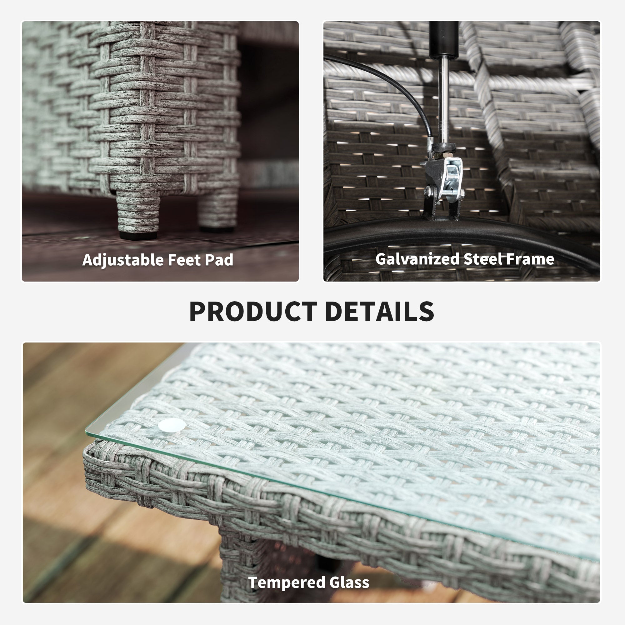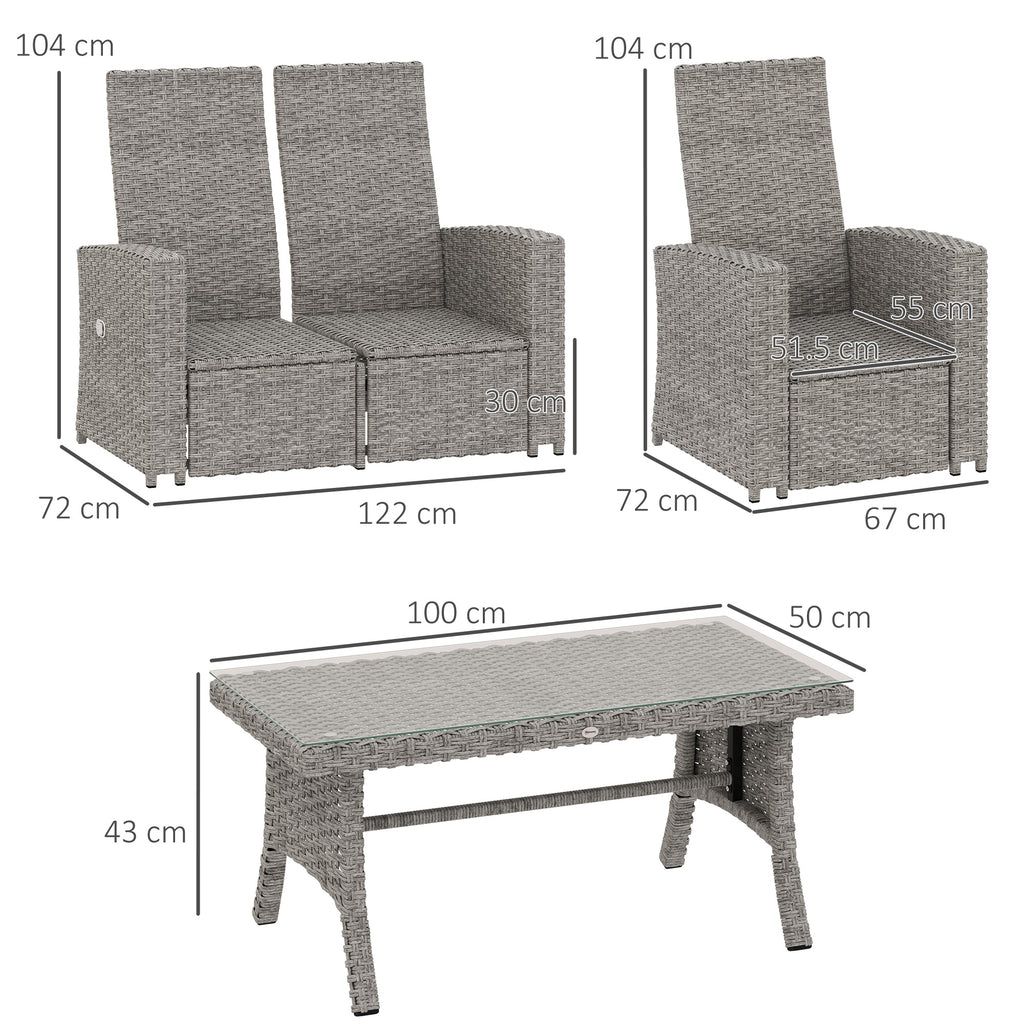 An inviting outdoors, this season and beyond: say hello to this rattan furniture set. All pieces have a galvanised steel frame for a strong core, wrapped in plastic wicker for double the durability-and style, of course. The two armchairs have 90°-135° reclining backs-extra relaxing points scored! Seat and back cushions for comfort. Complete with a glass-top coffee table.