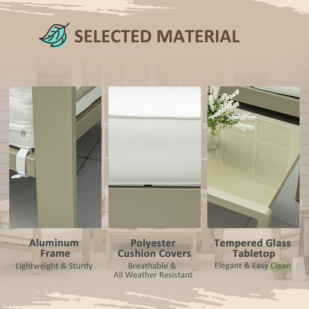 Comfort, with a chic touch - this four-piece garden set is here to make an impact in your home, this season and beyond. Each piece is made from powder coated aluminium for a strong core, coated in a champagne gold colour - elegant. Set comes with a two-seater sofa, two armchairs and a matching coffee table, bringing your closest people together. Seat and back cushions for comfort. A glass table top for a sleek finishing touch.