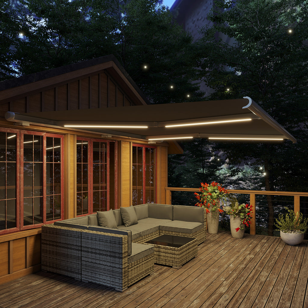 Provide cover for yourself outdoors instantly, with no fuss. Do it with retractable awnings for patios. It also comes with LED strips so it can light up the area when dark. The frame is made from a blend of aluminium and metal, ensuring it is solid and reliable for use outdoors in all weather. The 280g/m² canopy has a PU coating to shelter from sun glare and mild weather.