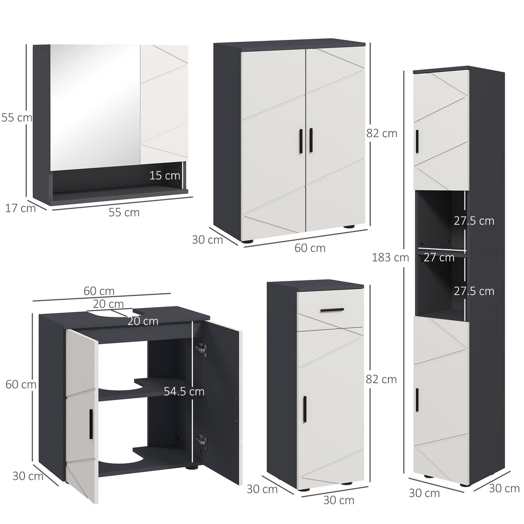 Transform your bathroom with the 5-piece bathroom furniture set. This chic ensemble includes a tall storage cabinet, two cosy floor cabinets, a pedestal sink cabinet and a sleek mirror cabinet, all designed for maximum storage with multiple shelves. The adjustable inner shelves cater to your storage needs, while the smooth, easy-to-clean surface and anti-tipping design add a touch of safety and style to your space.
