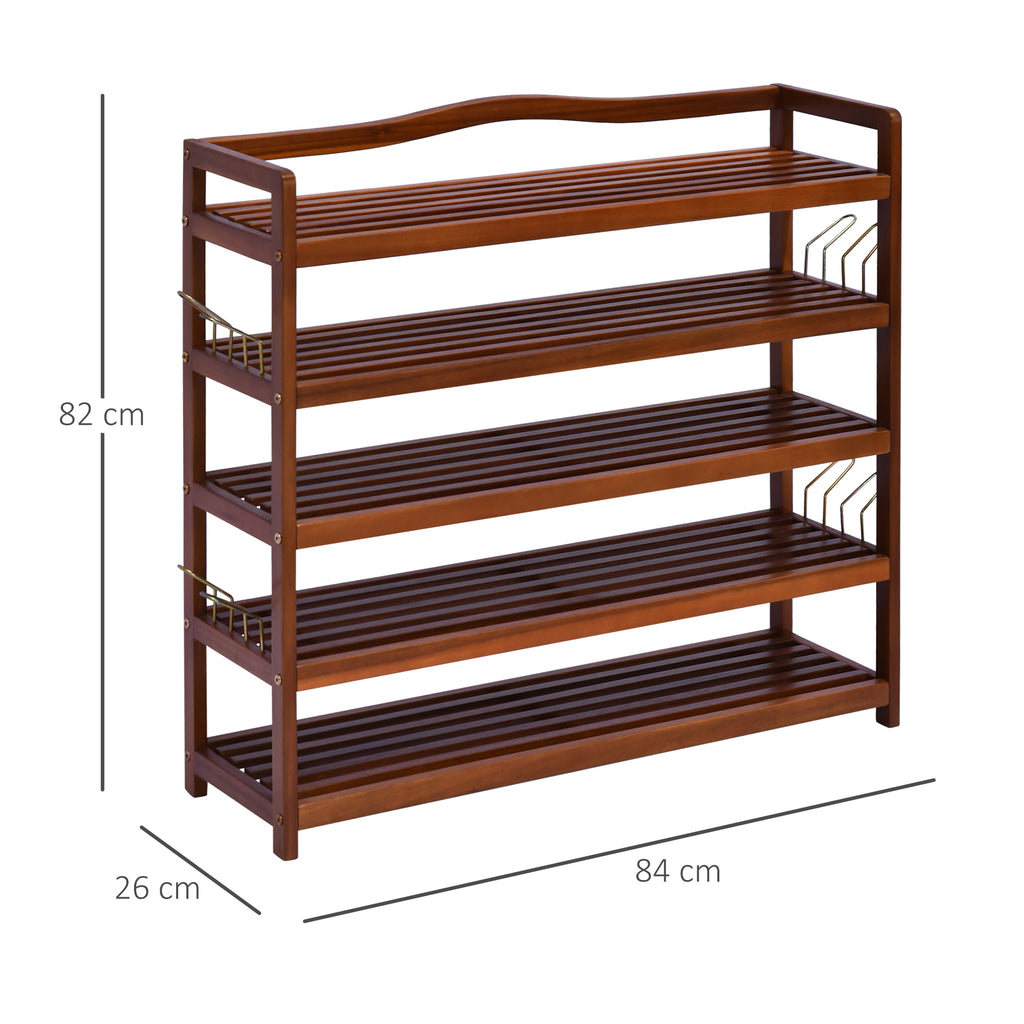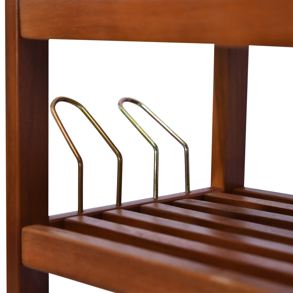 This wooden shoe storage by is a great solution for organising and storing your footwear. Made from Acacia wood in a 5-tier design, the wooden shoe rack is ideal for placing low ankle shoes on the 4 bottom tiers and boots for the top shelf. This shoe shelf also comes with side hangers for your slippers if needed. With a weight capacity of 80Kg per shelf, it can hold up to 25 pairs of shoes. Styled in a vintage look in a teak finish, it adds an elegant touch to any decor of your room.