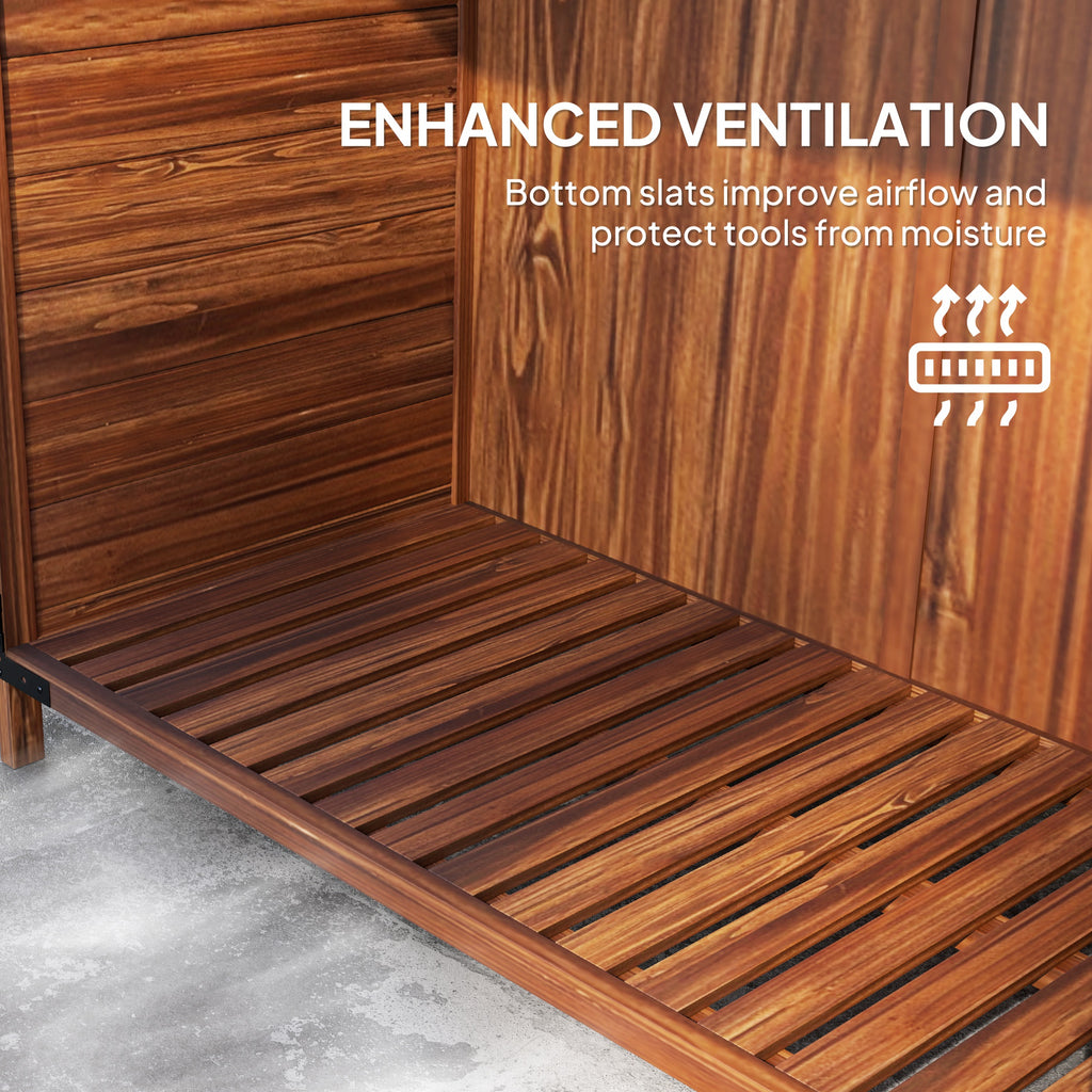 This wooden shed is an great spot for holding your gardening tools and more. It comes with double doors, so you can access inside easily. Made from solid wood with a handsome varnished finish, this is a strong, beautiful piece for the outdoors. Comes with two inner shelves for plenty of storage room.