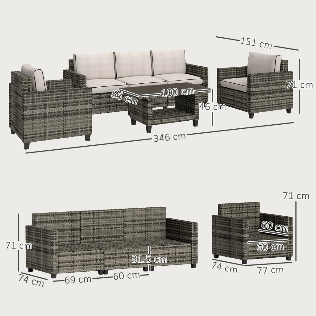 Transform your garden into a haven of relaxation with the 6-piece garden sofa set. This outdoor sofa set includes two corner chairs, a middle chair, two armchairs and a coffee table, all crafted from robust steel and PE rattan with a chic powder-coated finish. Enjoy endless layout possibilities to suit any occasion, while the plush, washable cushions offer optimum comfort.
