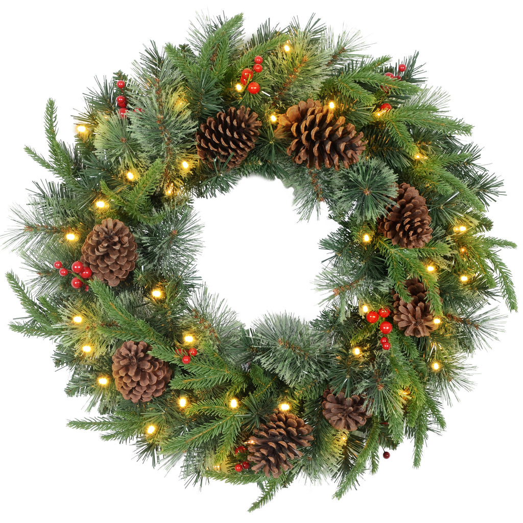 The perfect finishing touch to your Christmas, with this front door wreath. This 60" winter wreath is the perfect addition to doors, above the fireplace, in the hallway - and wherever else you wish. Thick plastic makes this a tough piece, with flame retardant branches for safety. Adorned with an abundance of pine cones and berries for that extra wintery look, this Christmas door wreath is complete with 50 LED lights.