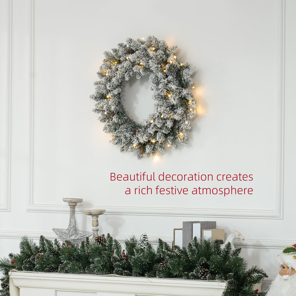 The perfect finishing touch to your Christmas, with this snowy wreath. This 60" winter wreath is the perfect addition to doors, above the fireplace, in the hallway - and wherever else you wish. Thick plastic makes this a tough piece, with flame retardant branches for safety. The all-over frosty look is adorned with an abundance of pine cones and berries for that extra wintery look; Christmas door wreath is complete with 50 LED lights.
