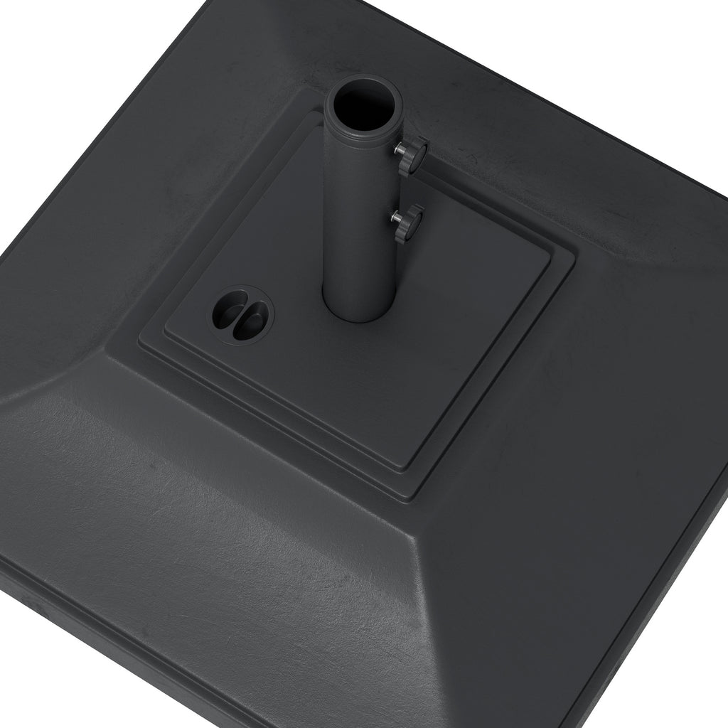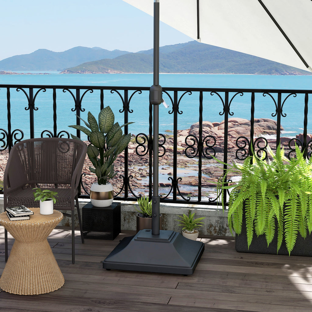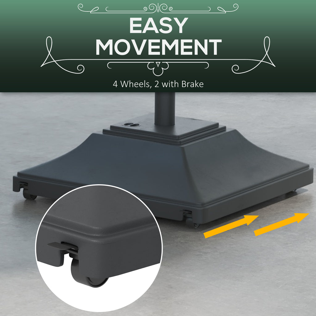 Keep parasol umbrellas firmly held in place: look to this patio umbrella base. Made from strong HDPE plastic, this is durable piece, resistant to light wear-and-tear. It's fitted with four wheels to roll easily when full. Fill with 45kg water or 60kg sand for plenty of weight. A powder coated steel pole for the parasol, complete with tightening screws to secure in place.