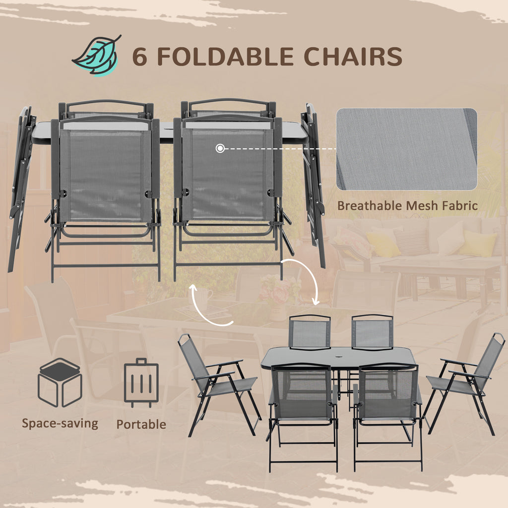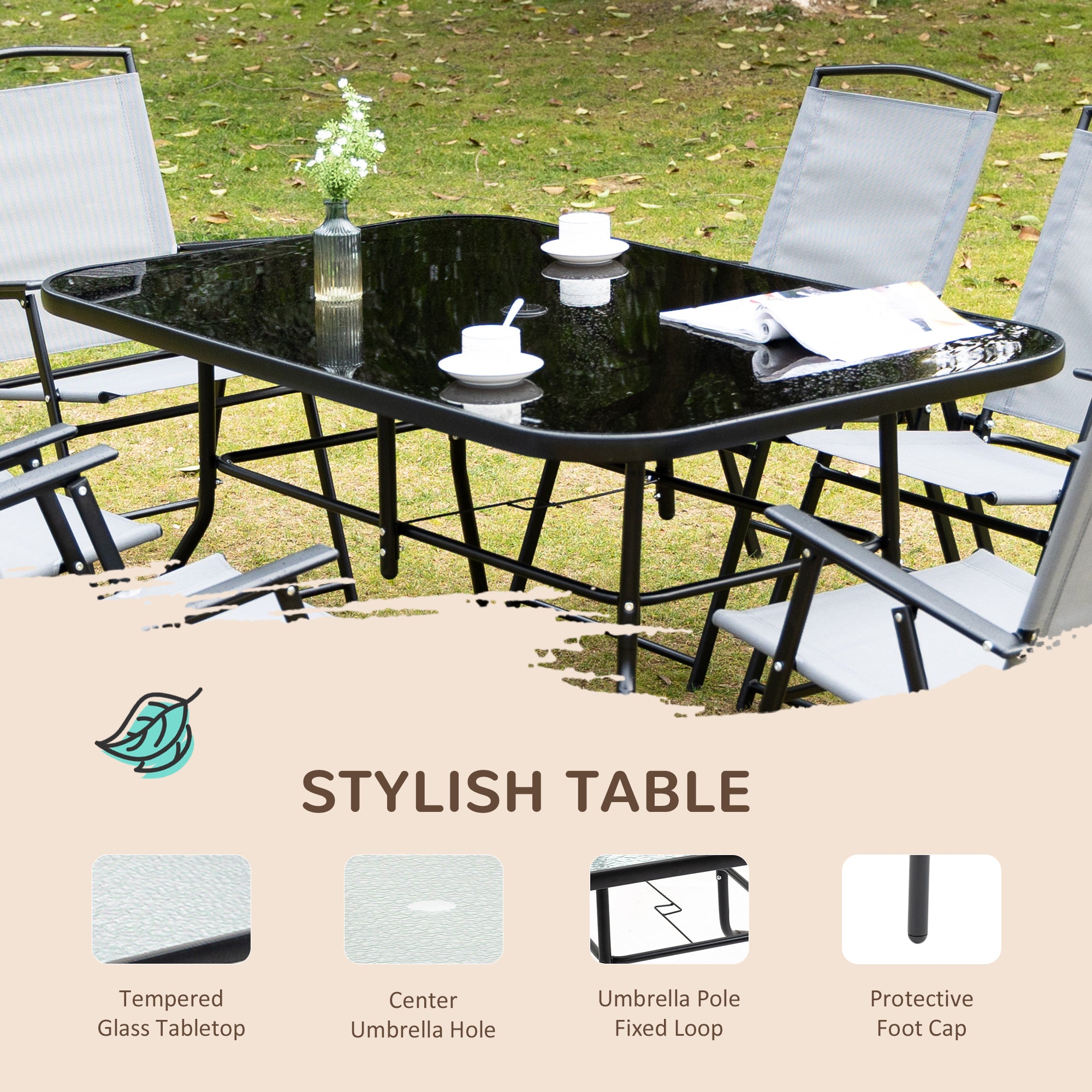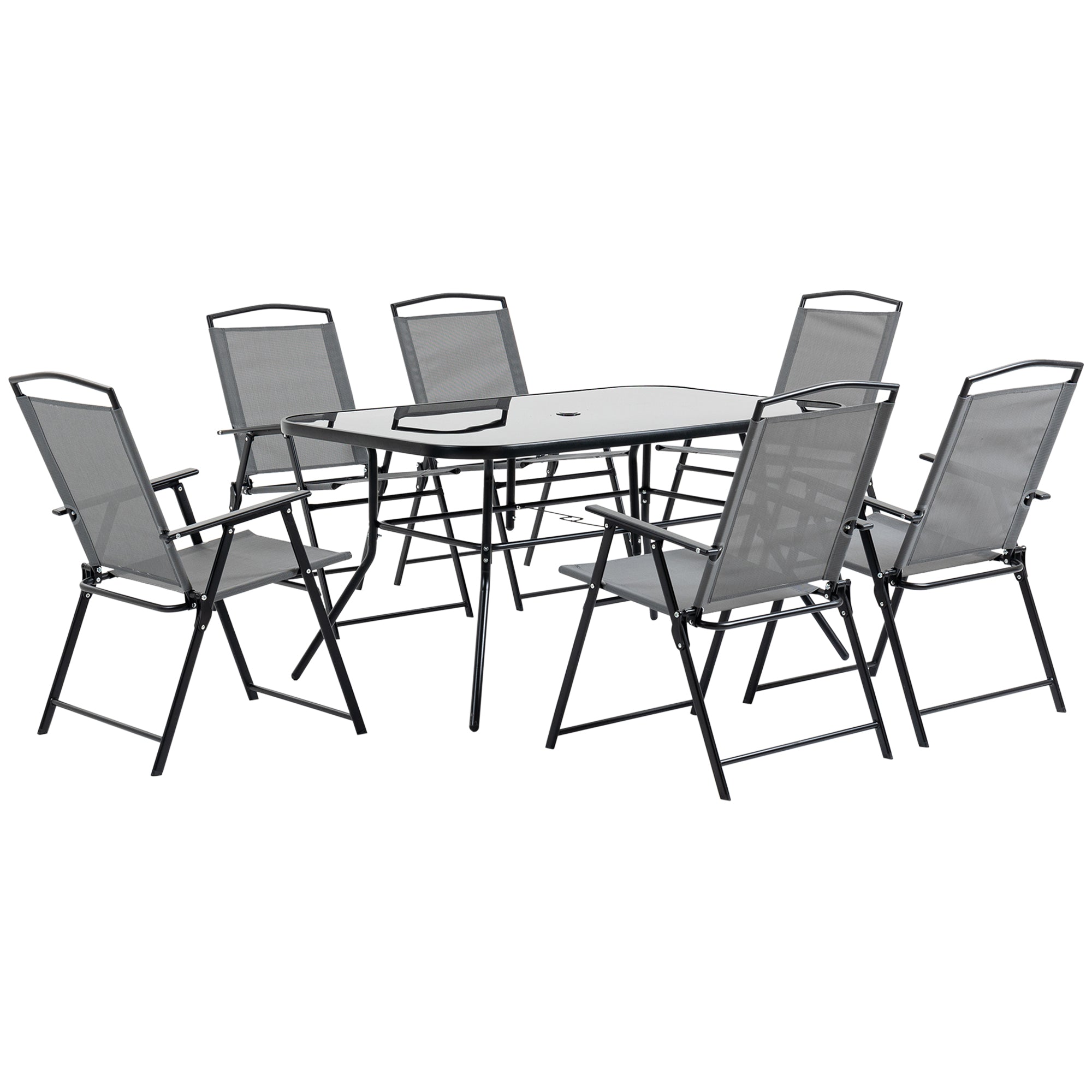 With this seven-piece outdoor dining set, you can quickly create a great place to hang out outdoors, spending time with your friends and family. It comes with six chairs and a large rectangular table - the glass table top creates a beautiful, sleek look. The table has a hole in the middle, allowing you to place a parasol umbrella for lots of shade against the sun. Start enjoying your time outside this season and beyond.