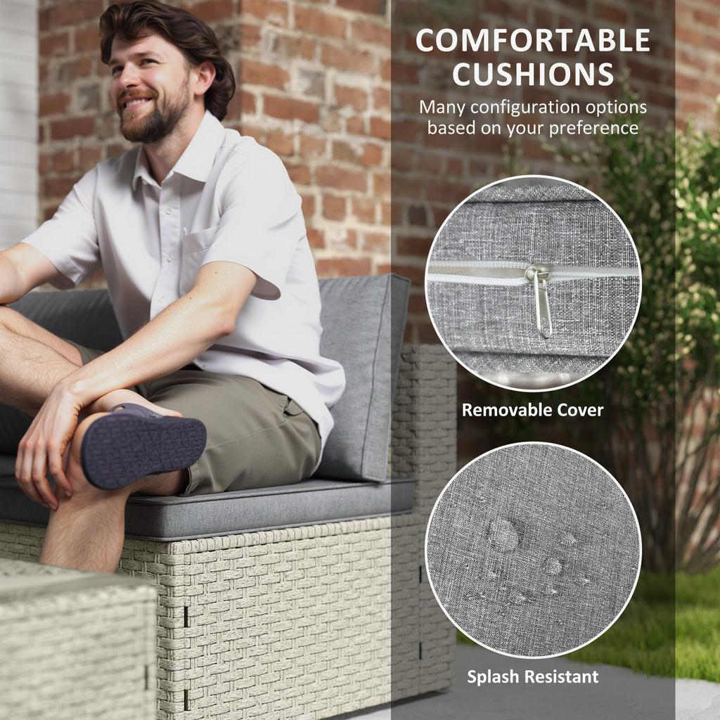 Bring some serious style into your outdoors with this corner garden furniture set from . The rattan corner sofa set comes with two corner chairs, four middle chairs and a matching table for flexible combination as you like. Steel frames mean a strong core wrapped in plastic rattan, offering double the protection and durability. The rattan furniture seats are finished with soft cushions all over, making this outdoor furniture set great to have in your space too.