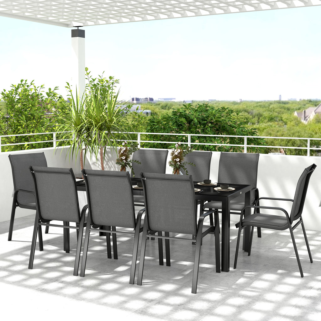 Transform your garden into a stylish dining oasis with the 8 seater garden table and chairs. Featuring breathable mesh seat and back for quick-drying comfort and chairs that stack to save space. The tempered glass top is scratch-resistant, providing a sleek, modern look while being easy to clean and maintain. It offers durability, ensuring your furniture stays looking fresh and stylish for years to come. This outdoor furniture set is great for garden parties and family gatherings!