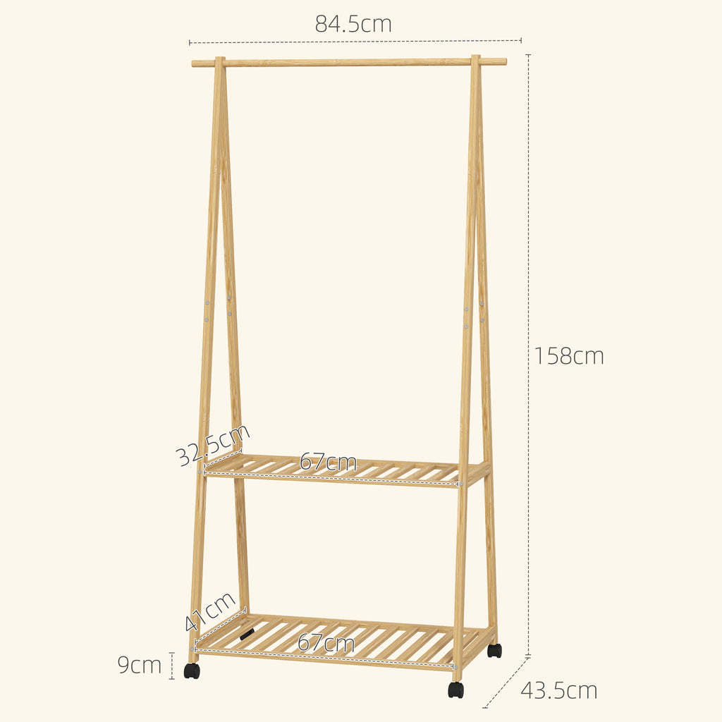 No matter how tight the space, it's easy to keep clothes and shoes properly hung and stored with this clothes rack. Made from robust and beautiful bamboo, it comes with a 67cm hanging rod, two bottom shelves and two hooks: for all types of clothing, shoes and small accessories. The 'A' shape frame means it keeps balanced and steady. Garment rack supports up to 14kg.
