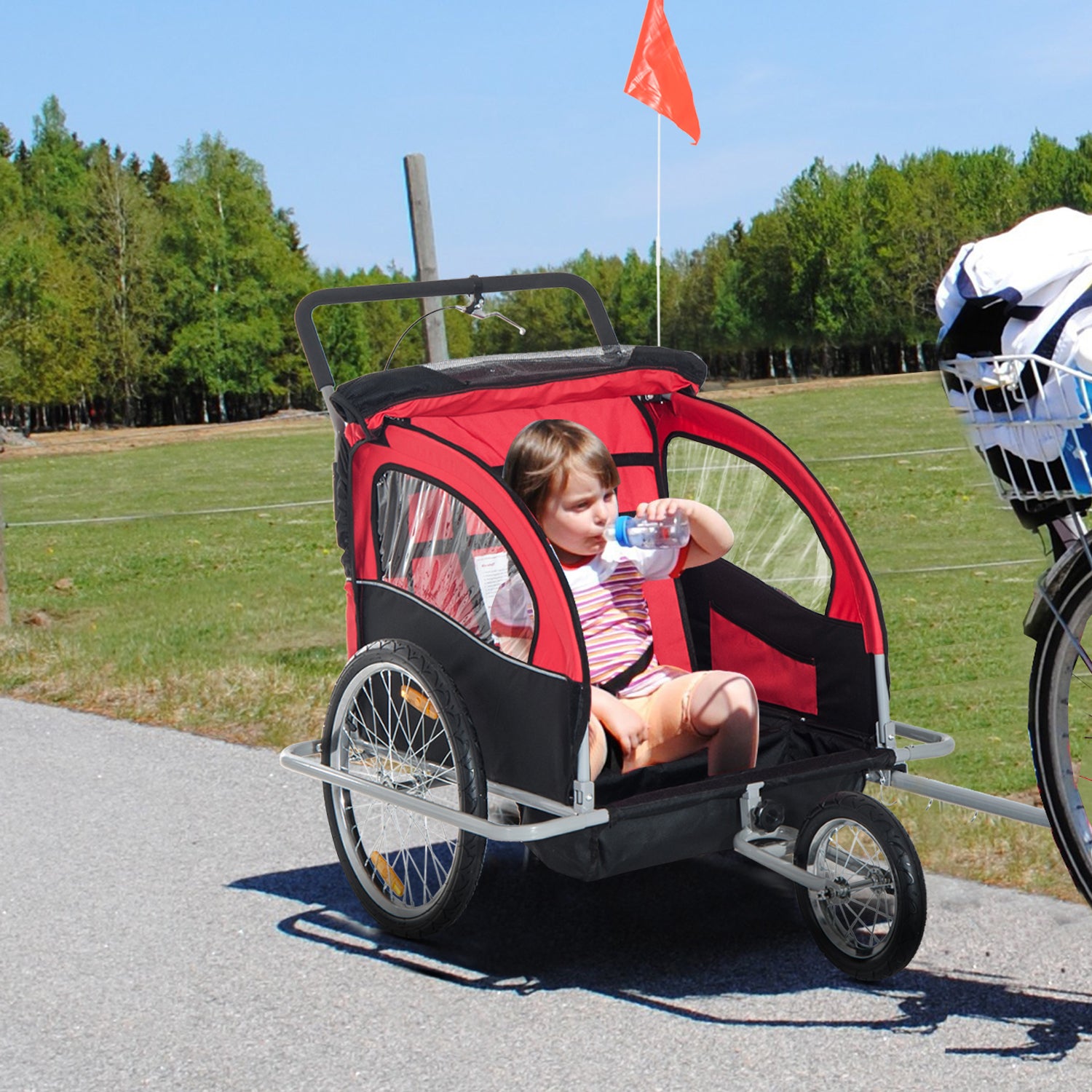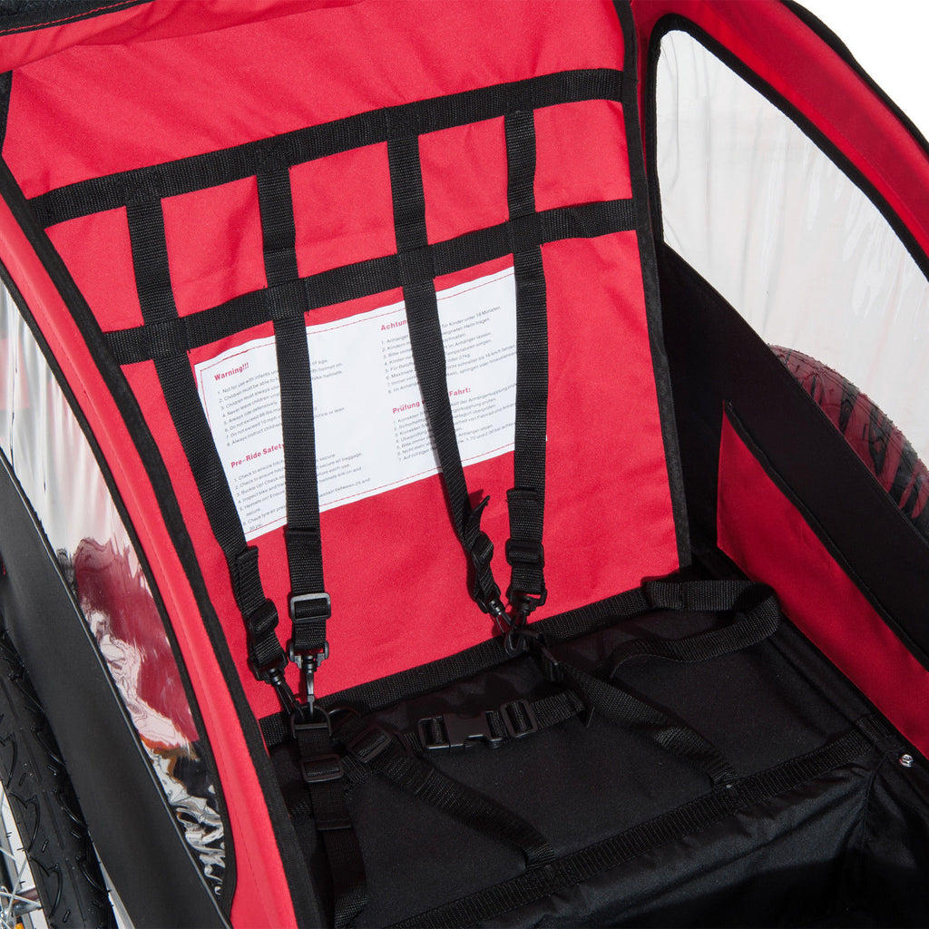 A convenient and convertible toddler bike trailer unit from constructed in durable and lightweight steel frame. The rear area of the bike trailer for children provides additional storage for carrying all the essentials. Quick release 20" smooth-rolling wheels offer the stability and smooth riding experience. Conversion to storage or use can be done within few seconds without any tools. A sling seat with five-point harness keeps your children secure.
