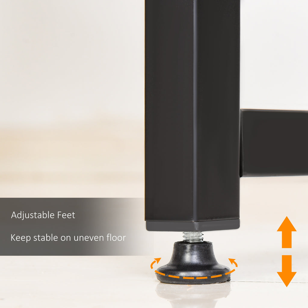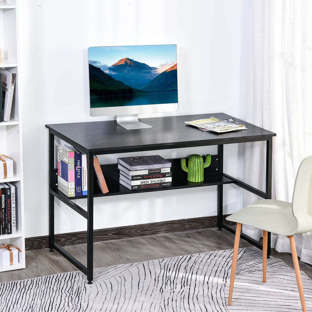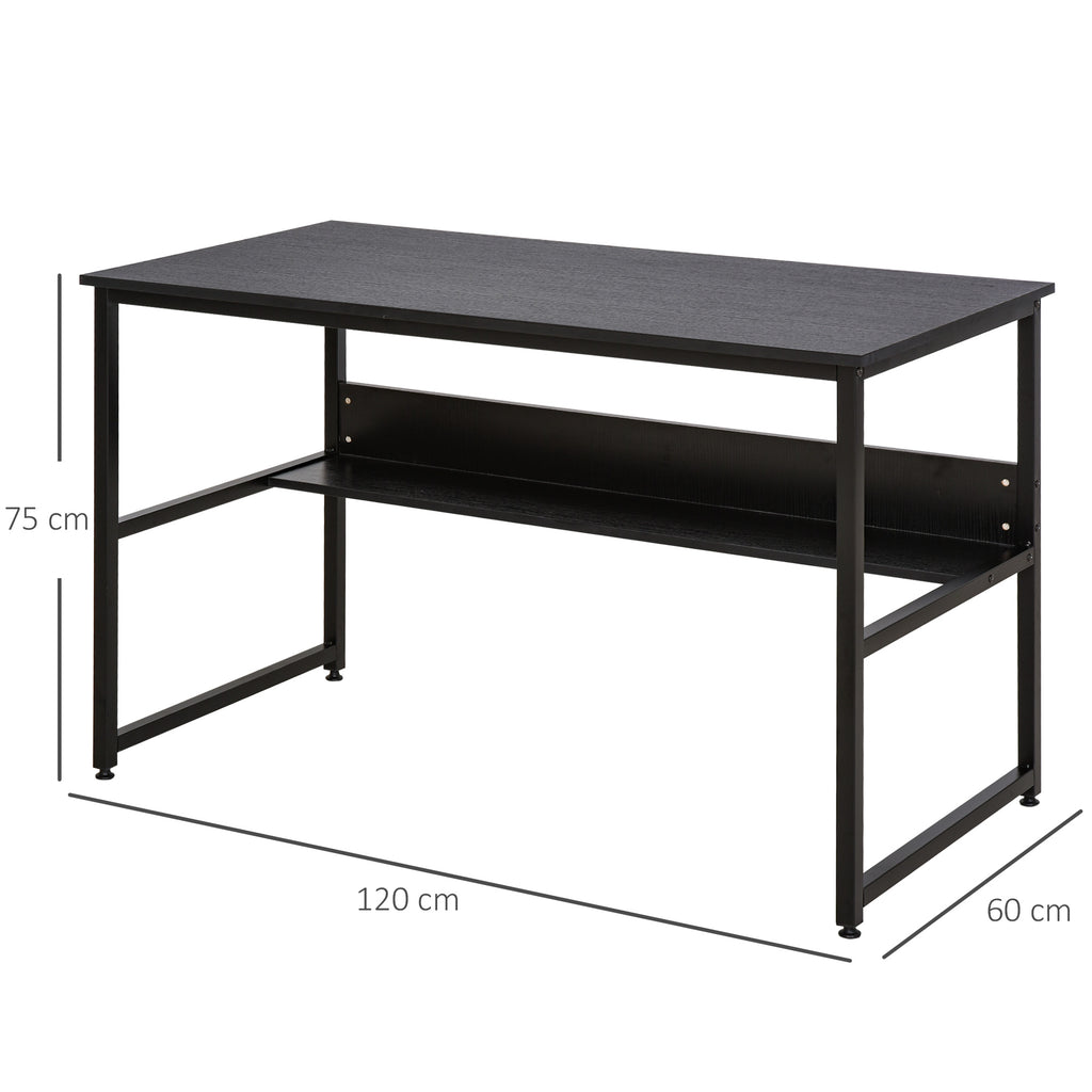 Create the perfect environment for working from home with this two-tier work desk It uses a metal frame for a tough and sturdy structure, with thick particle board shelves for a solid and flat surface to work from. Both shelves are covered with melamine, so they are smooth and are protected against lighting marks and damage. The bottom shelf features a back panel, which allows safe storage and out of sight. This office table can make your work enjoyable.