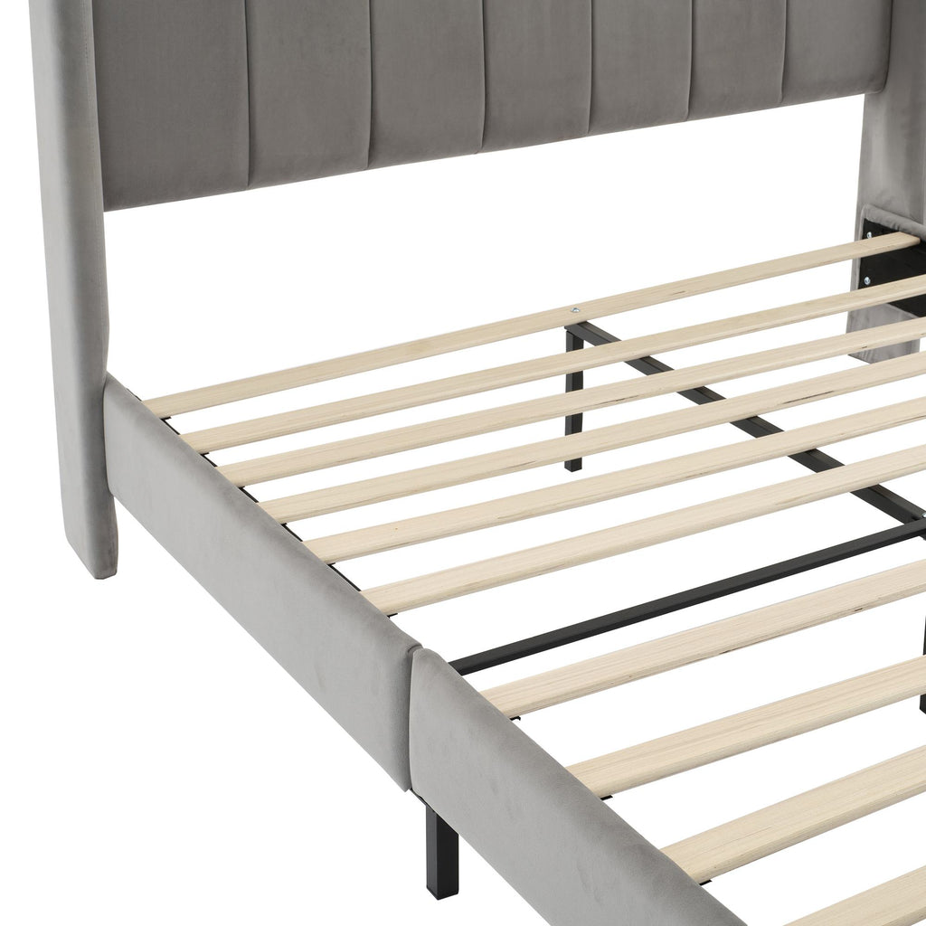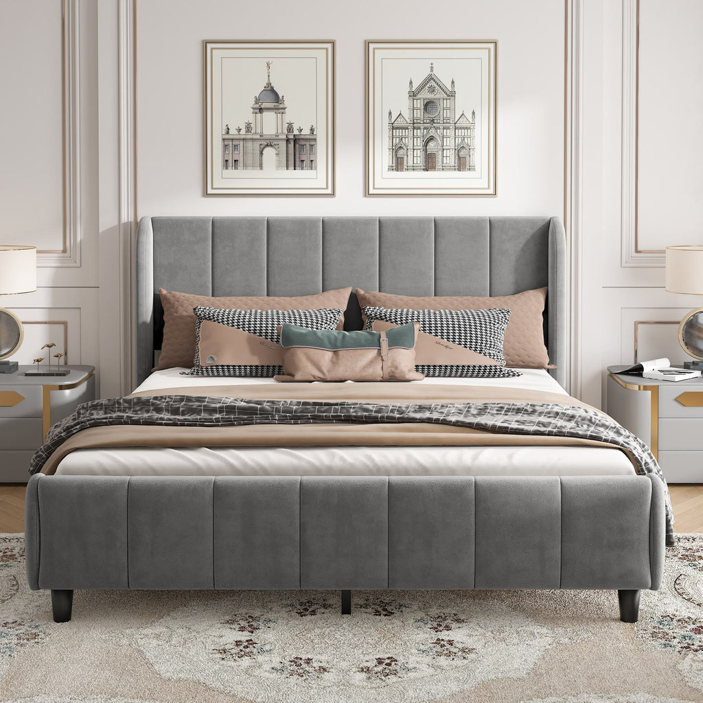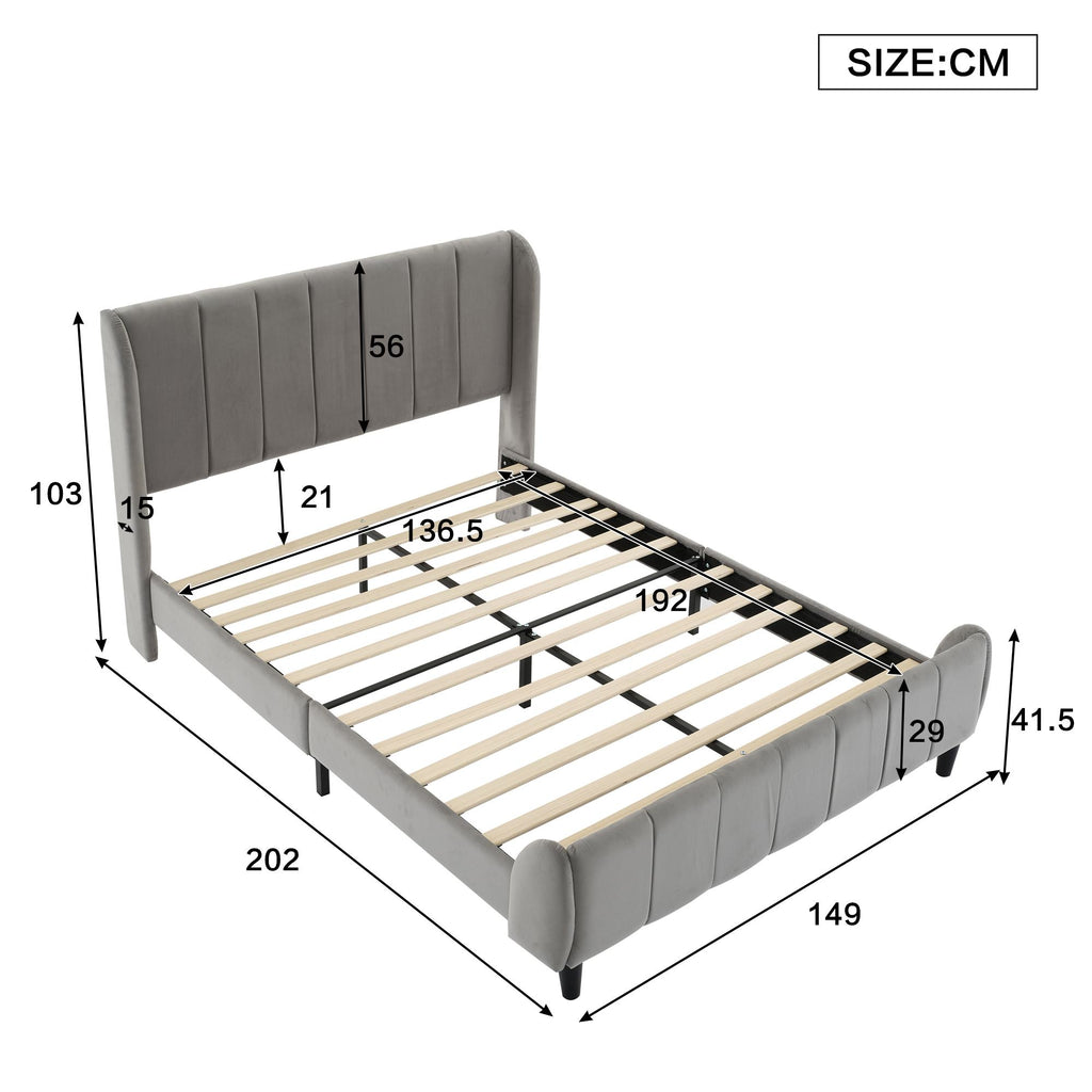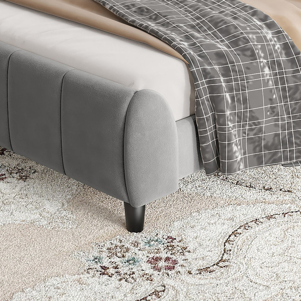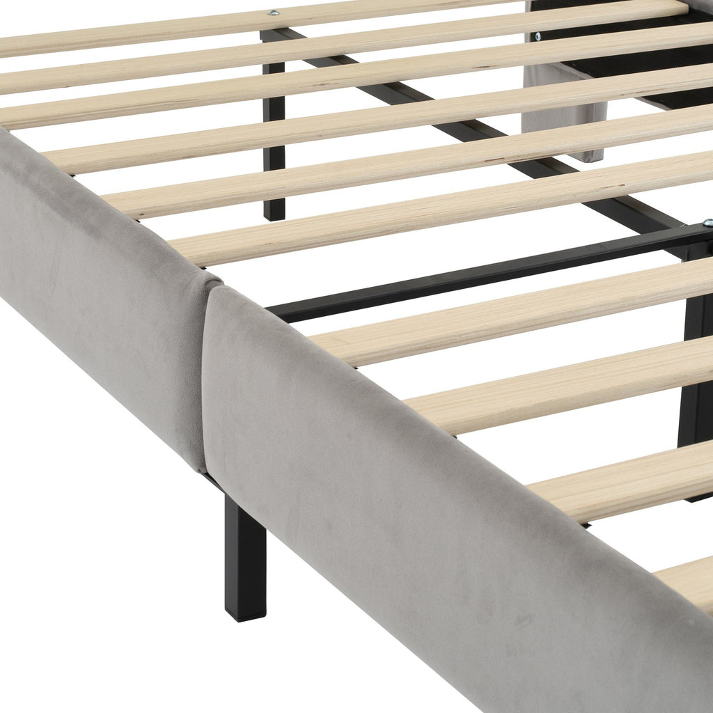 Double Upholstered Velvet Bed with Soft Backrest - Gray