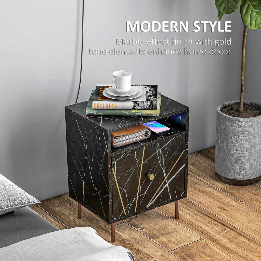 An essential for your living space, in a bold and elegant design - this bedside table. With a large drawer, upper open shelf and flat tabletop, there's plenty of room for nighttime essentials. Metal legs for support, so it stands steady. The black colour with marbled effect and gold coloured accents make this bedside locker a bold and beautiful centrepiece for your bedroom and beyond.