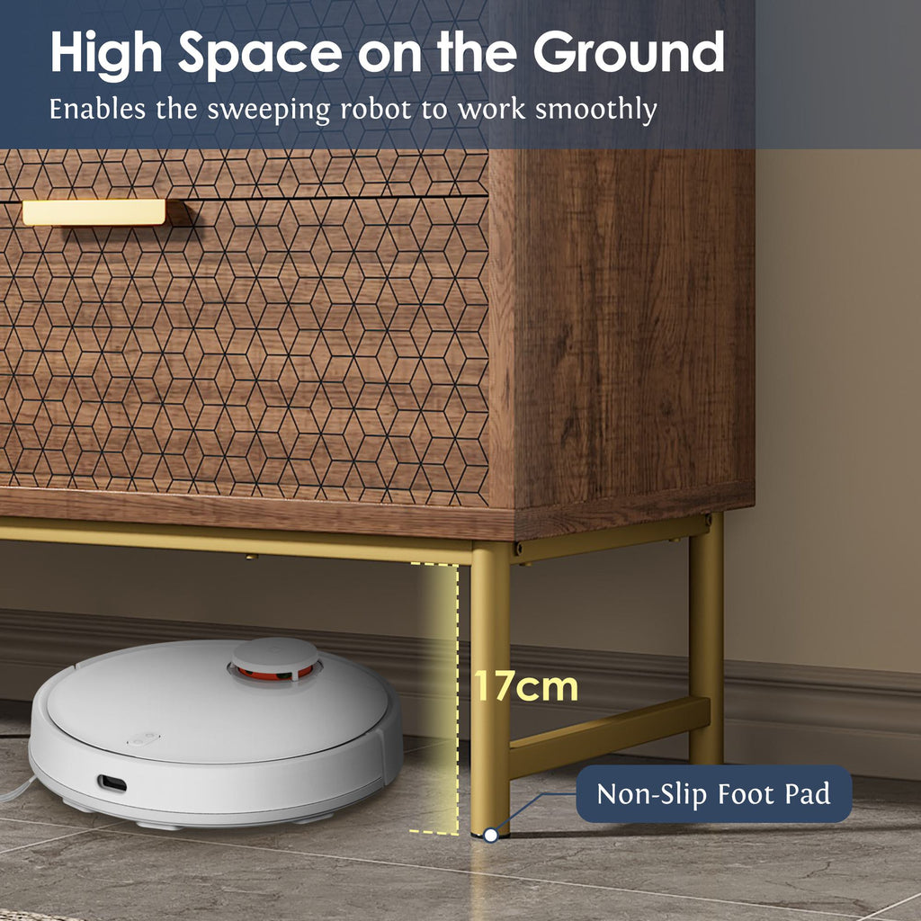 Enhance your living space with this stylish Embossed Design Sideboard Cabinet Dresser, perfect for the living room, hallway, bedroom, or children's room. Crafted from durable metal and chipboard in a rich walnut finish, this sideboard features six spacious drawers with embossed fronts, offering ample storage for all your essentials. The cabinet stands 17 cm off the floor with adjustable metal support feet, ensuring stability and ease of cleaning. With a weight capacity of 40 kg on top and 5 kg per drawer, this sideboard combines functionality with modern elegance, making it a versatile addition to any home.