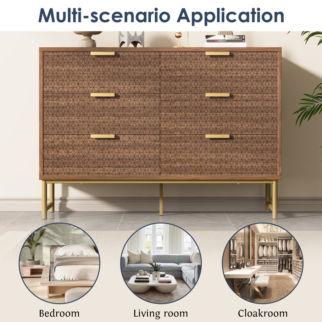 Embossed Design Sideboard Cabinet Dresser with 6 Drawers, Anti-tip, Storage Cabinet for Hallway, 120L x 40W x 75H cm, Walnut