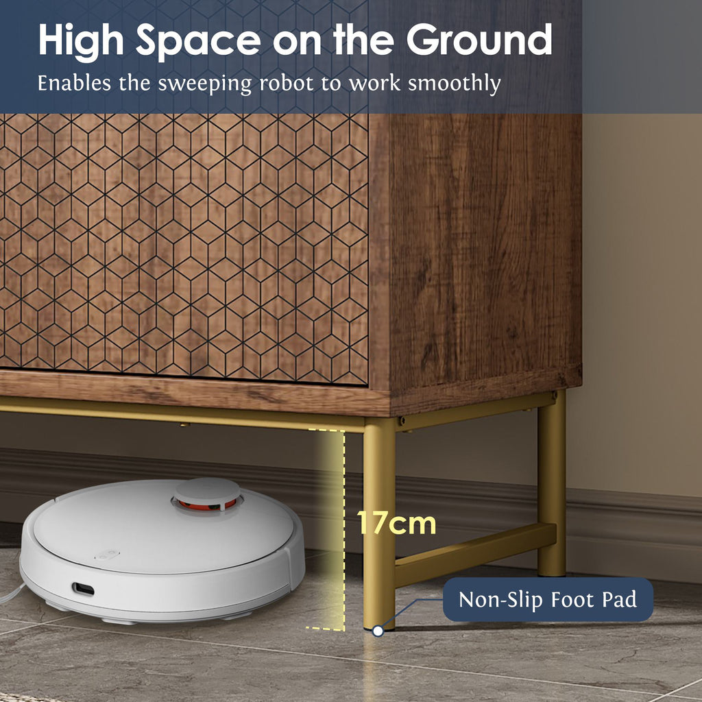 Elevate your living space with this Embossed Design Sideboard Cabinet Dresser, featuring three drawers and two doors with adjustable compartments. Crafted from metal and chipboard in a stylish walnut finish, this sideboard offers a modern aesthetic with its embossed texture and natural wood grain. The flexible shelf adjustment system allows for three levels of height adjustment, ensuring maximum space utilisation for various items. With a ground clearance of 17 cm and adjustable metal support feet, this cabinet is easy to clean and stable on different floor conditions, making it perfect for any room in your home.
