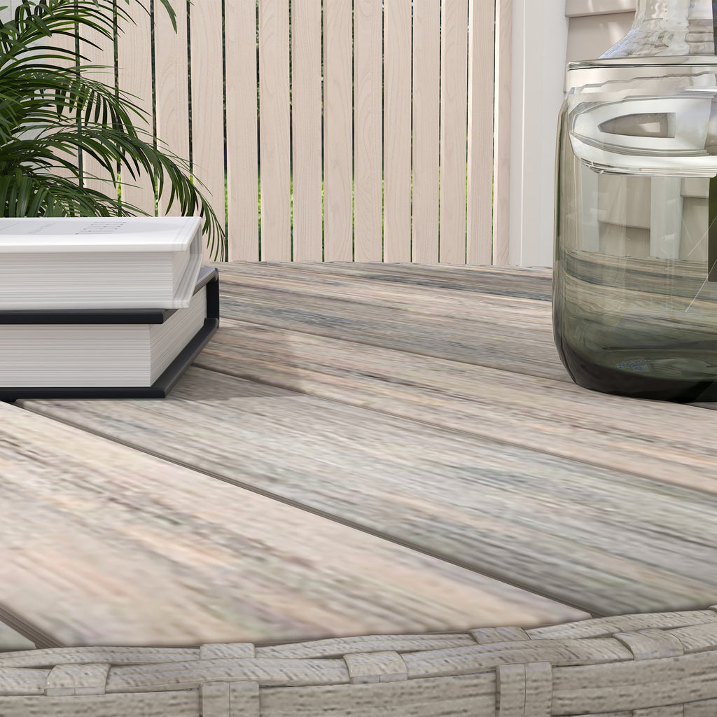 Relaxing outdoor times with company: look to this rattan dining set. It's formed of four chairs and a round table - gather round with company. The two-tier table provides double holding room, right next to you; the wood-effect tabletop looks great. Steel frames for a strong core, wrapped in stylish and robust plastic wicker. Complete with padded seat cushions to sit in comfort.