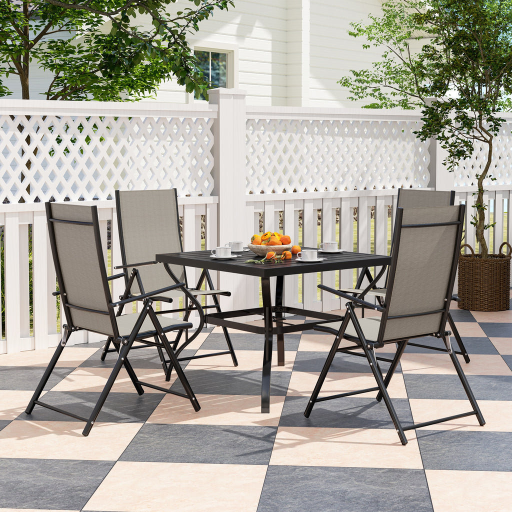 Simple, stylish outdoor dining with this outdoor dining table and chairs set. It comes with a square dining table and four matching folding chairs: plenty of room for you and company. The powder coated galvanised steel frames mean the patio table and chairs are strong. The folding chairs save space and come with breathable texteline seats for comfort. This outdoor garden furniture set is complete with Φ50mm hole in the table to hold a parasol umbrella in place.