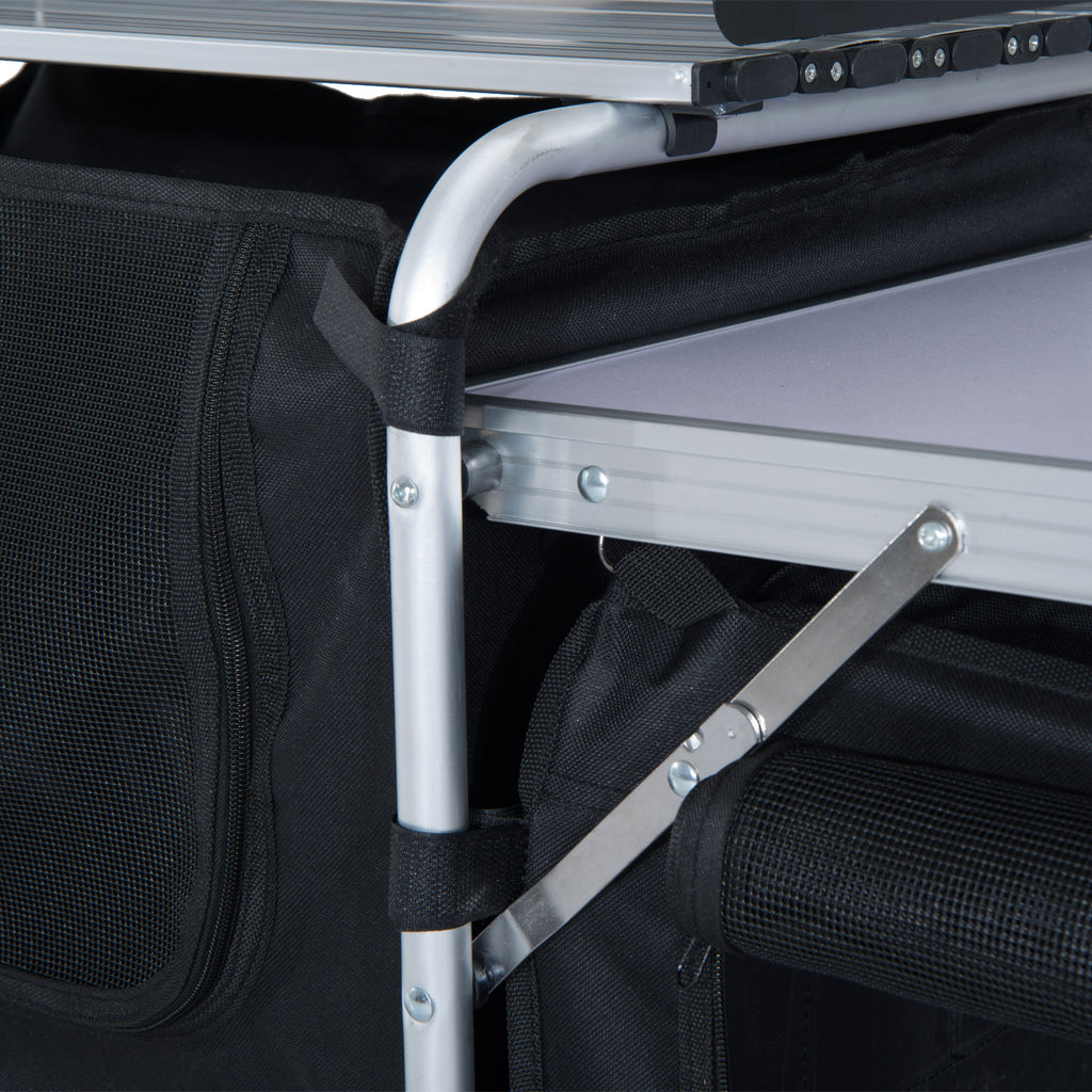 With plenty of room for all of your cooking gear, our portable camping kitchen unit really gets the job done when you need to prep food on the go. The spacious camping storage unit has plenty of room, including 3 aluminium tabletops and 3 cupboards. 's camping cooking table helps keep you organized so that you spend less time looking for utensils and more time seeking adventure.