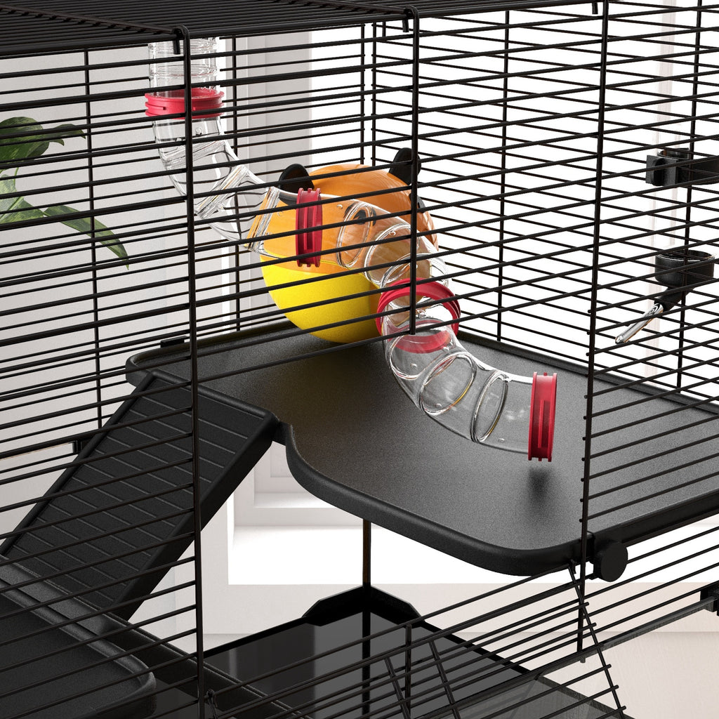 Upgrade your small pet's living space – choose this hamster cage. Consisting of multiple tiers, it includes tunnels and two ramps for them to get around, providing endless fun and adventure. There's an exercise wheel to keep them active, whilst the hut gives them a place to relax comfortably. Plus, the water bottle and food dish keep them fed and hydrated. Elevate your hamster's well-being with this wonderful habitat – and watch them thrive.