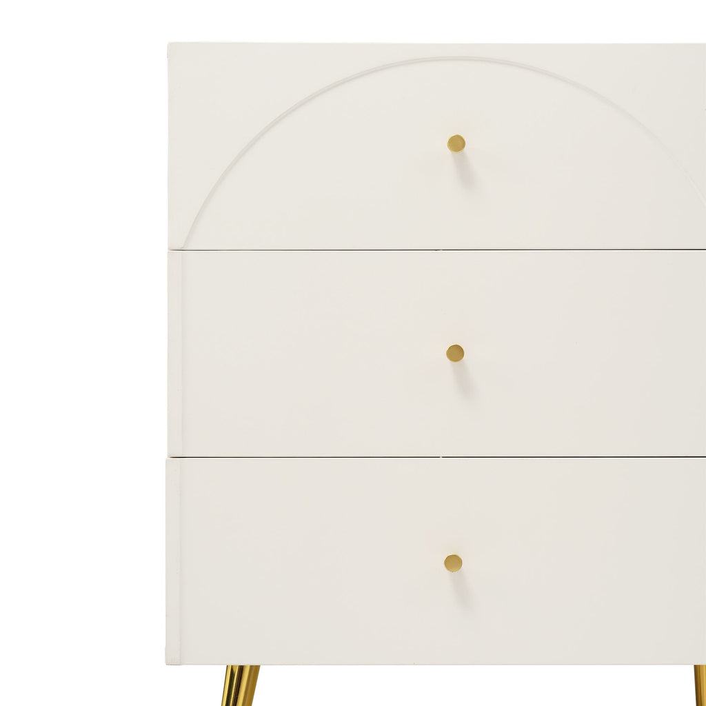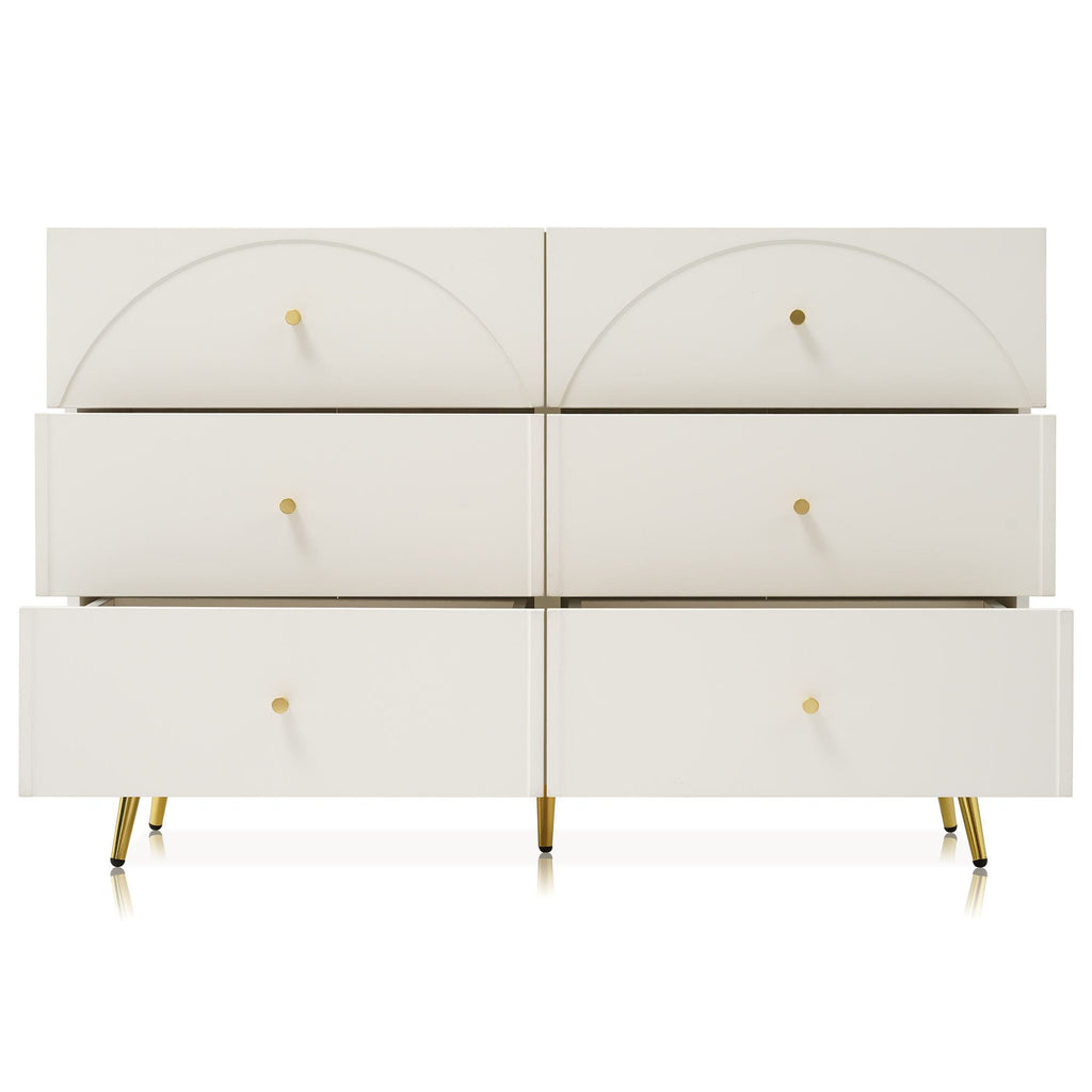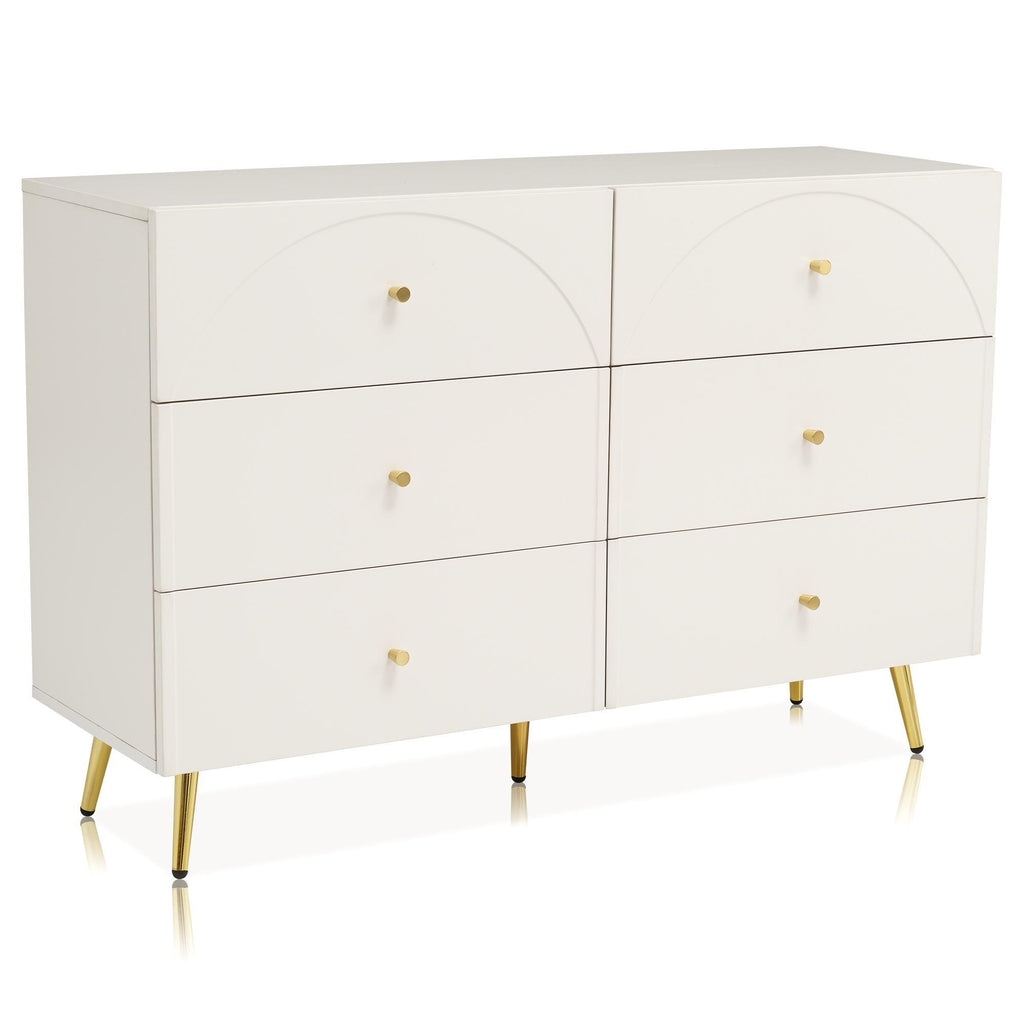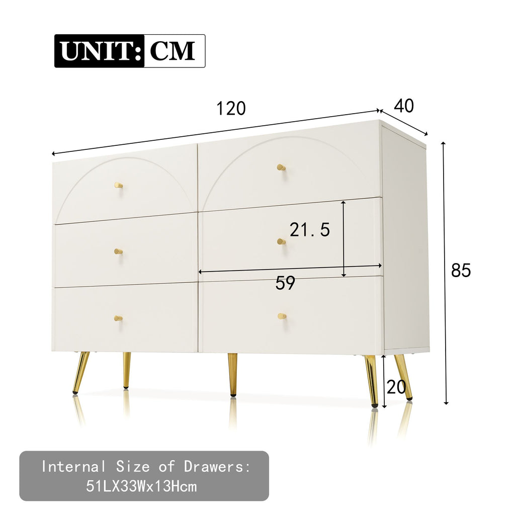 Elevate your living space with this elegant cream white sideboard cabinet, featuring six spacious drawers with arched fronts that add a touch of timeless sophistication. Crafted from high-quality particle board and metal, this sturdy chest of drawers offers ample storage with each drawer measuring 51L x 33D x 13H cm, perfect for organising your essentials. The adjustable middle leg ensures stability and protects your floors, while the generous ground clearance of 20 cm adds to its practicality. Easy to assemble with clear instructions, this cabinet is a stylish and functional addition to any room.