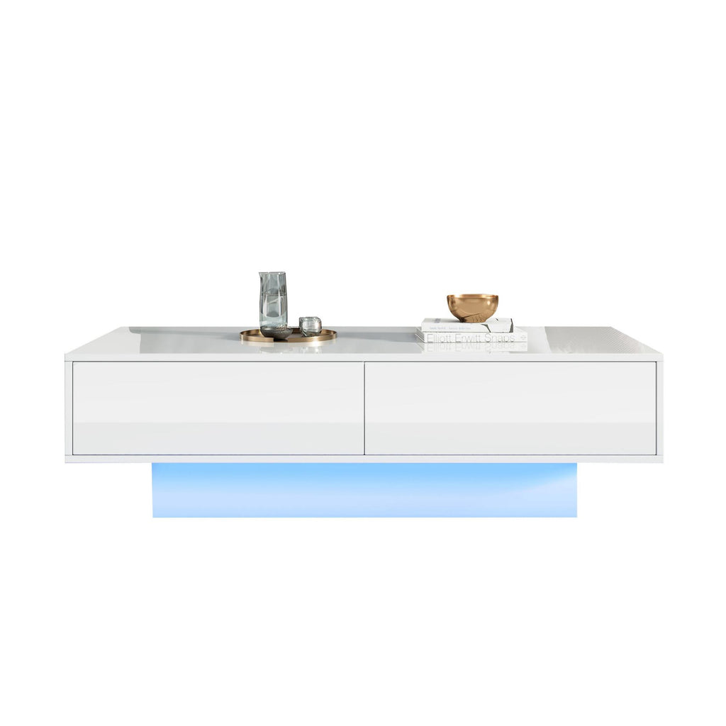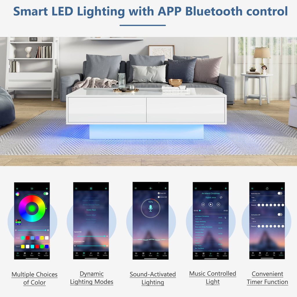 High Gloss LED Coffee Table with 2 Drawers and Bluetooth Control, Tea Table with Particle Board, 115L x 55W x 34H cm, White