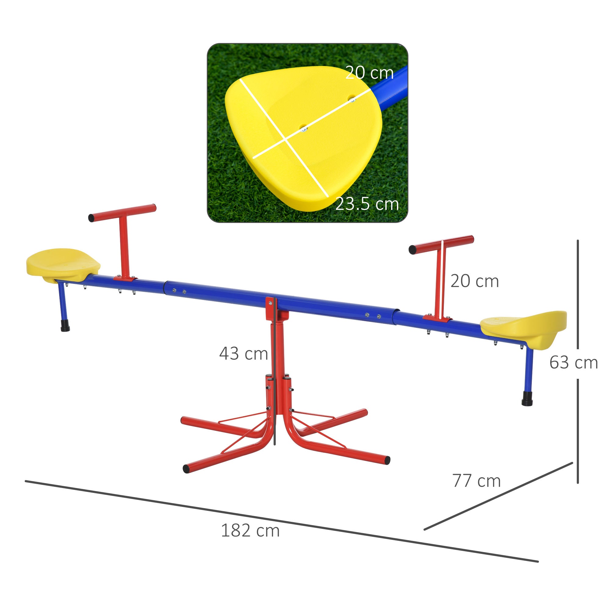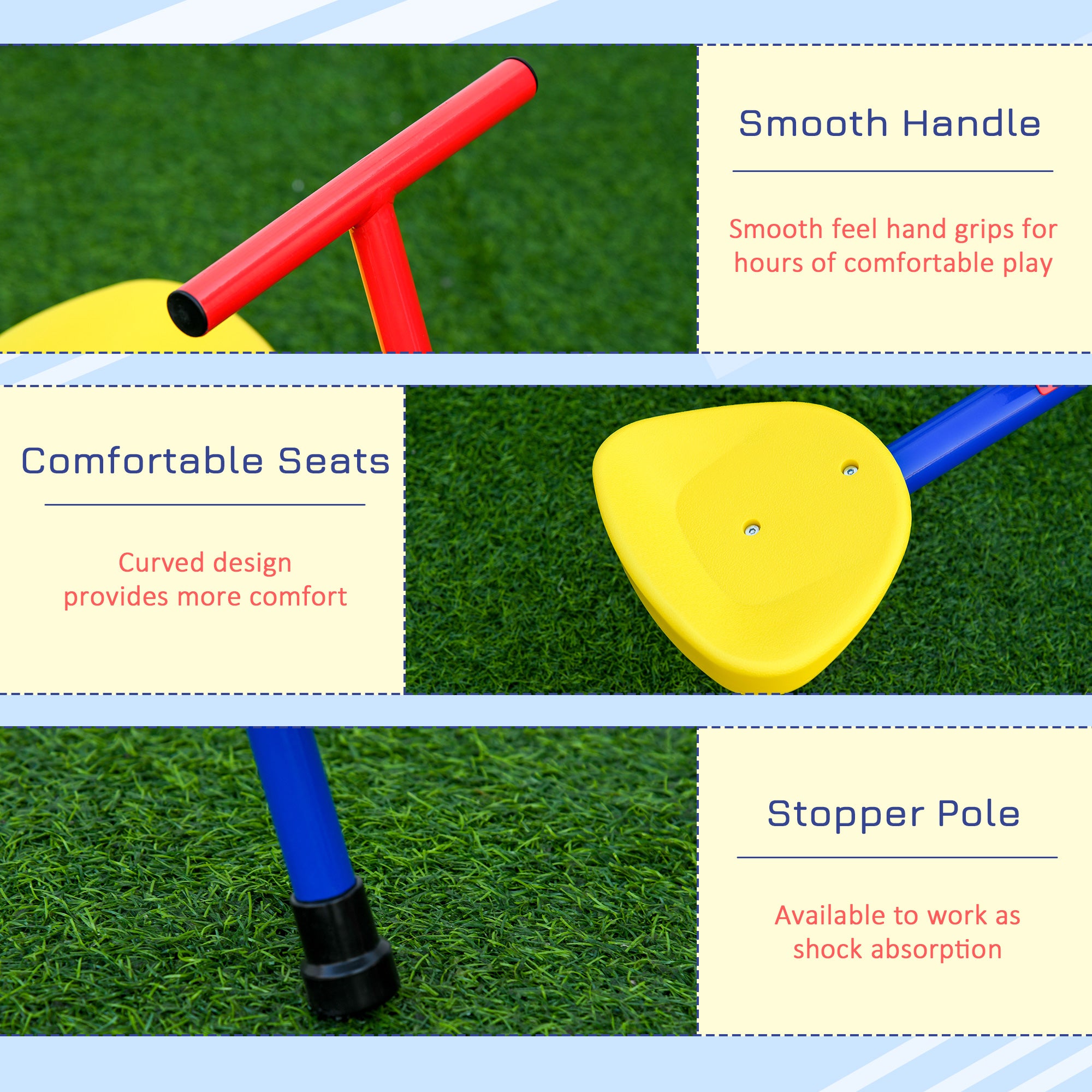 Our seesaw for kids is a great toy for children that combines the fun of a traditional seesaw with a 360-degree swivel. Constructed with a metal frame in powder coating, this teeter totter can thrive throughout years of play. Its sturdy metal frame, easy-to-grip handle, and comfortable seats make the seesaw a backyard favorite for any fun-loving kid ages 3-8. It is safely equipped with a stopper pole under each seat to absorb shock to the seats as they touch the ground, ensuring a smooth and soft landing. A great toy to provide hours of fun while burning off energy and helping them to work on balance and motor development!