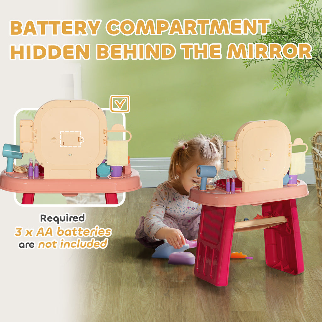 Bring something different to playtime with the kids vanity table. Featuring a mirror with magical LED lights and a faucet that plays music and really releases water, this makeup vanity set is great for creative, make-believe games. It also includes a special spot for the towel and hand sanitiser container, promoting good hygiene during play. This compact piece fits perfectly in a corner let the fun begin!