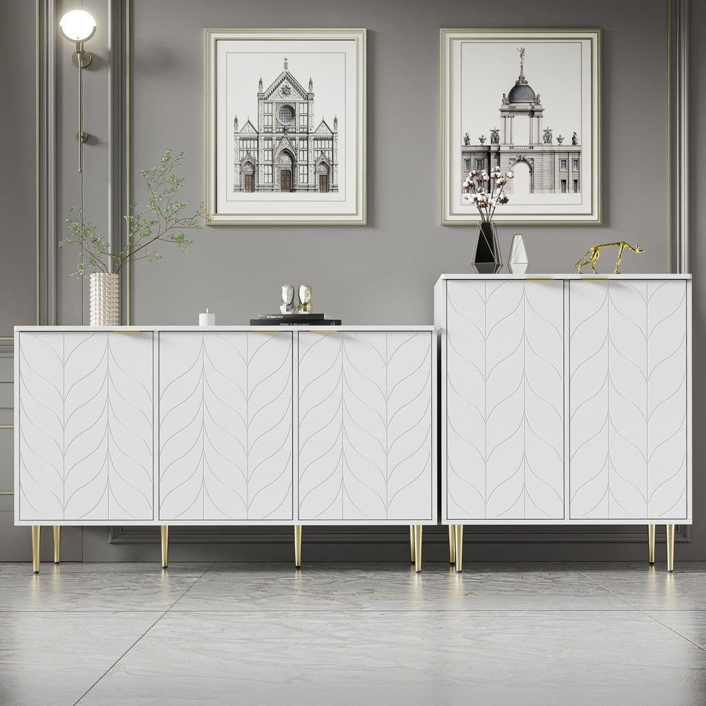 Elevate your living space with this elegant sideboard, featuring two doors and a chest of drawers, perfect for the living room, bathroom, or bedroom. With its gold-plated feet and handles, this piece adds a touch of luxury to any room while offering ample storage with three shelves and six compartments. Crafted from durable MDF and finished in a sleek white lacquer, it combines style with practicality, ensuring your belongings are neatly organised. The rounded design ensures safety, and pre-drilled anti-tip holes provide stability, making it a secure addition to your home.