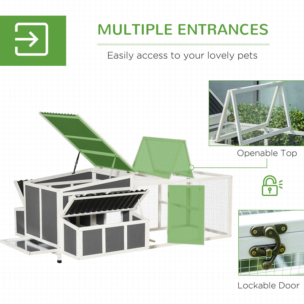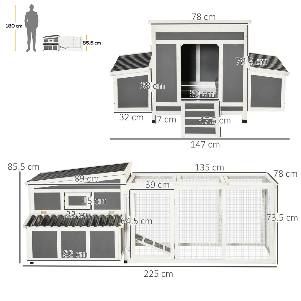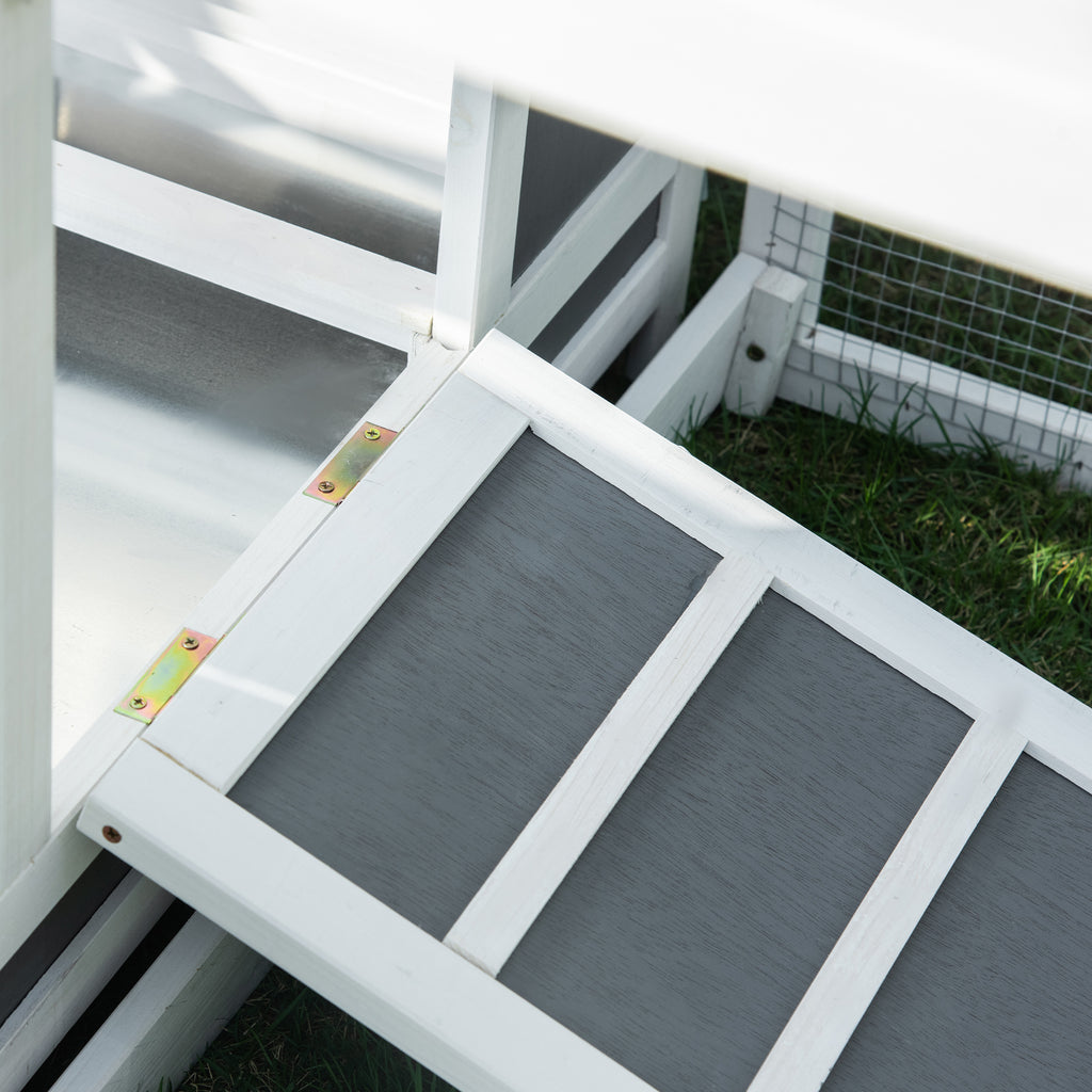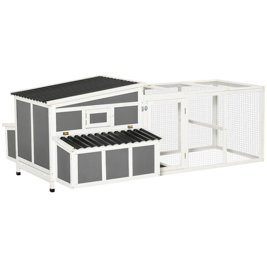 Treat your chickens to a cosy home with this spacious coop, which has a main house and run connected by a ramp. A sheltered area for relaxing and an outdoor space, offering fresh air and room to roam. It includes two nesting boxes for up to six chickens, so they can lay eggs. An openable roof and multiple doors provide easy access, it's easy to keep their space tidy, especially with the removable tray. Wooden structure for durability, providing a strong home that's ideal for outdoors.