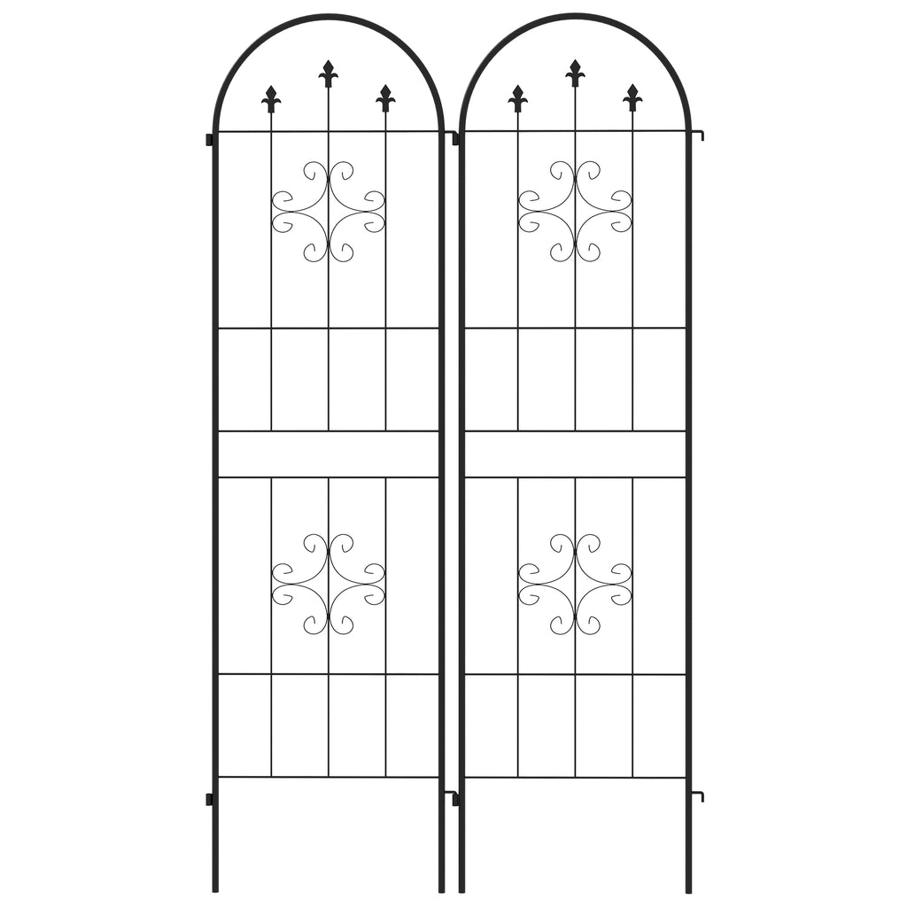 These metal garden trellis frames allow you to grow plants vertically. A pack of two for double the growing room. Both are made from powder coated metal for a strong structure. Bottom spikes to insert into the ground. Complete with curved lines and anchors for decoration.