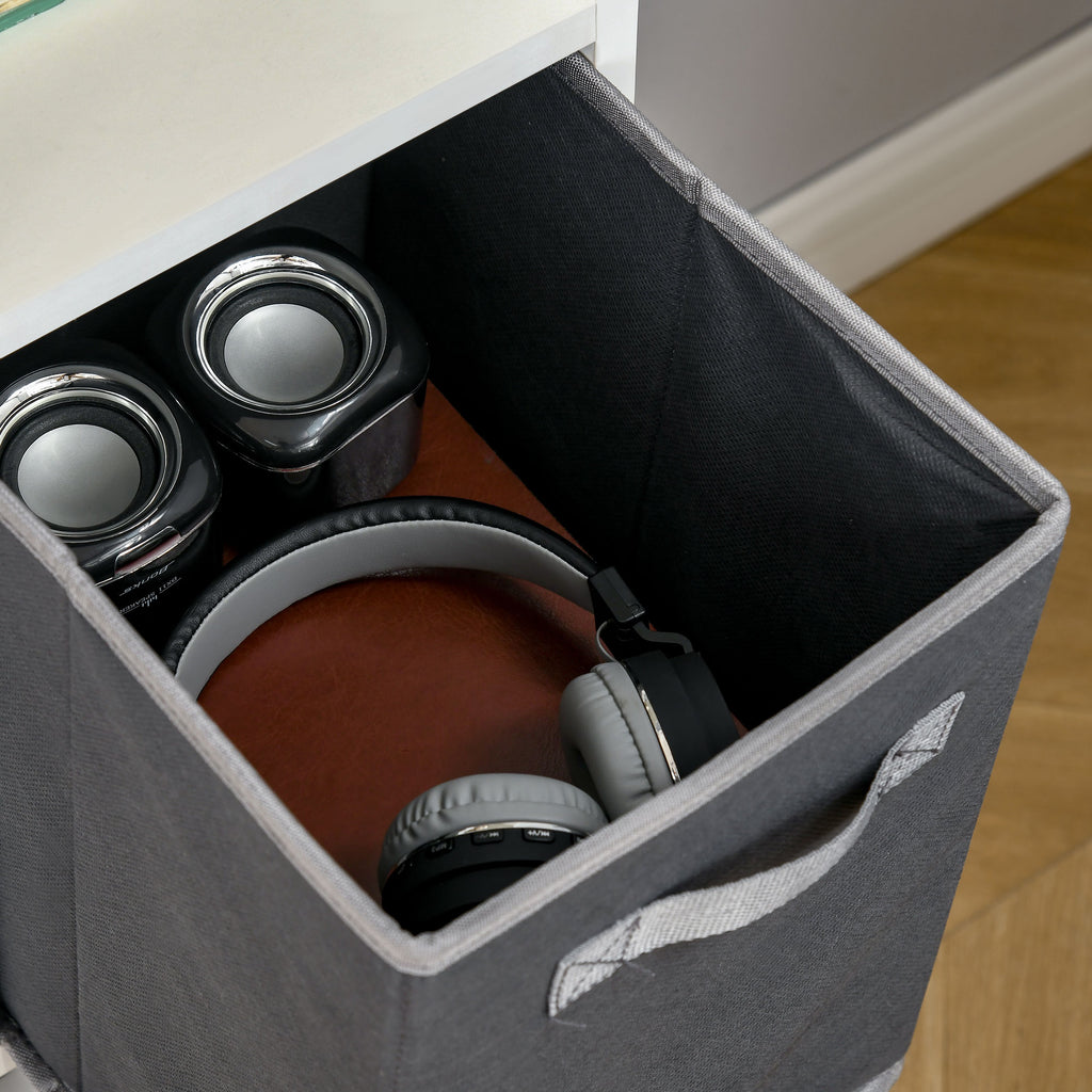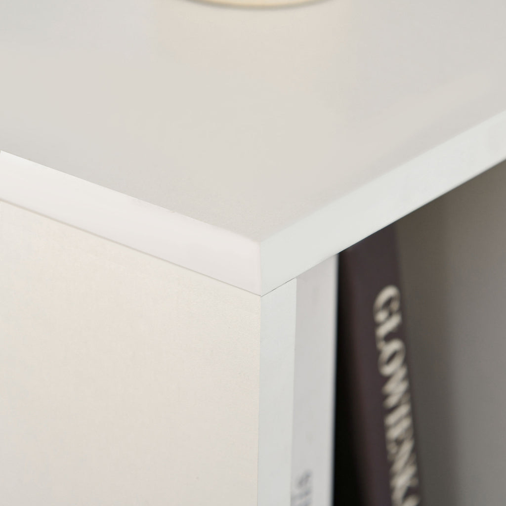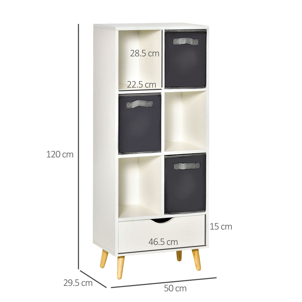 Style and storage, simplified. Bring this small bookcase with drawers into your home and office areas - like the reception, bedroom and kids play areas. A combination of six shelves - three with removable fabric drawers - and a bottom pull-out drawer gives you lots of open and closed storage to keep presentation tidy and interesting. The wooden legs keep the cube unit standing steady. Made from particle board, this storage shelving unit is durable and comes with anti-tipping straps for safety.