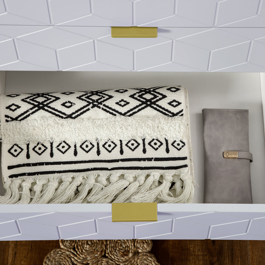 Every home needs furniture which has its own charm. For yours, look to this storage dresser. It comes in an art deco inspired design, where the white frame is fitted with blue embossed drawers and gold tone finishes on the base and drawer handles. It features five drawers - two small and three large, so there's plenty of room for everything you want in there. Complete with a metal base, this dresser is fully supported when full, up to 50kg total.