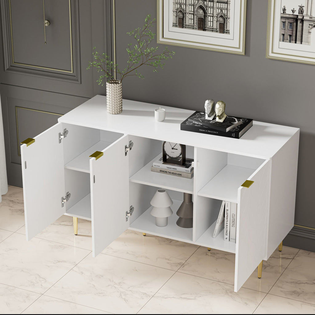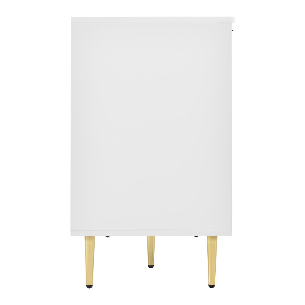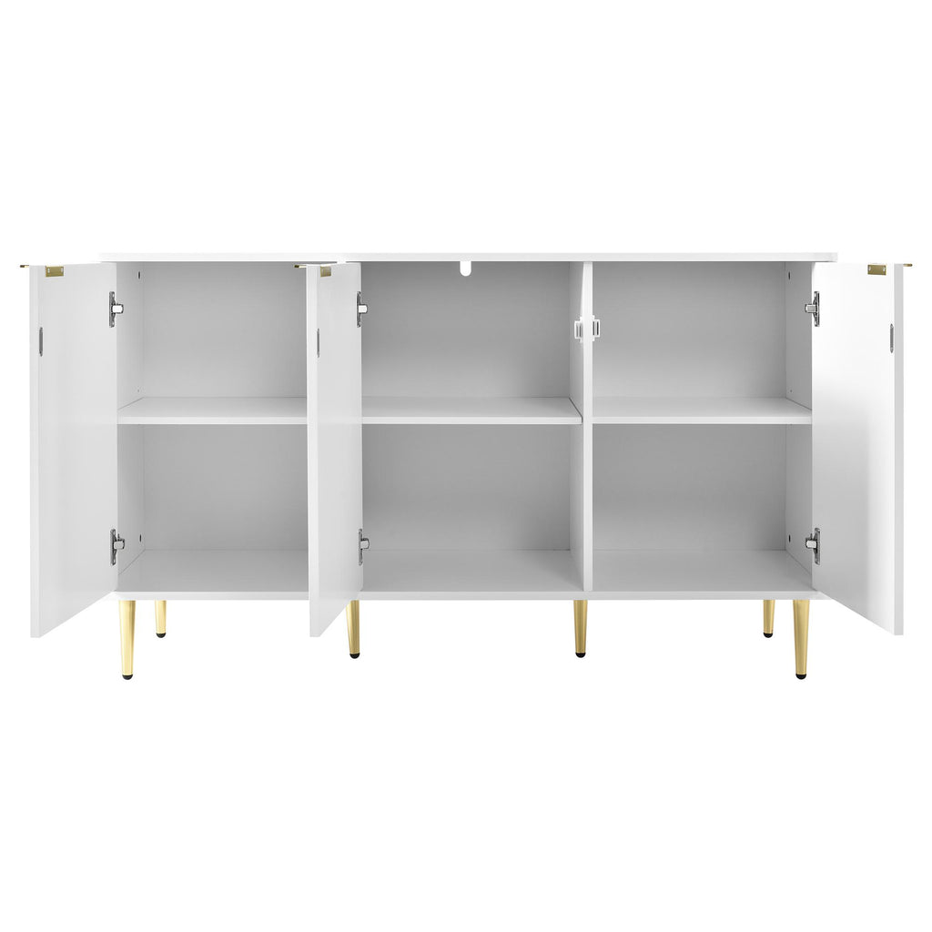 Elevate your living space with this modern dining room cabinet, featuring gilded legs and handles for a touch of luxury. Crafted from durable MDF and finished in a sleek white lacquer, this cabinet boasts rounded corners and a robust painted surface that resists scratches and moisture. With two layers and six compartments, it offers ample storage for any room, whether it's the bedroom, living room, or bathroom. The electro-chrome plated gold handles add a sophisticated flair, while the anti-tip device ensures safety, making it a stylish and practical addition to your home.